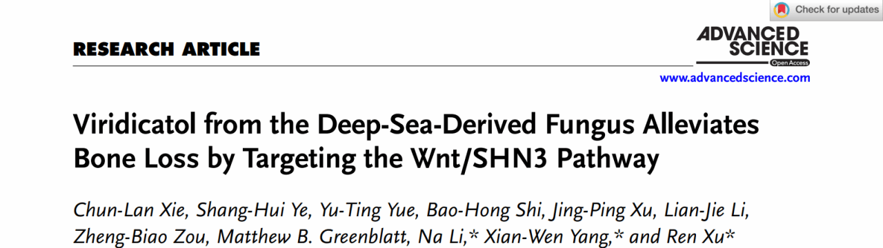 海南医科大学/海南省医学科学院的杨献文研究员团队多年来专注于深海真菌天然产物研究(J. Med. Chem. 2024, 67, 7504-7515; Org. Lett. 2024, 26, 5695-5699; Org. Lett. 2024, 26, 3889-3895; Chin. Chem. Lett. 2024, 35, 109723; Chin. J. Chem. 2024, 42, 3283-3292; Chin. Chem. Lett. 2022, 33, 2057-2059)。近期,该团队与厦门大学许韧教授课题组合作,从该团队构建的海洋微生物天然化合物库(CoLMM)中选择251个深海真菌来源的化合物进行活性测试,发现喹啉酮生物碱viridicatol(VDC)可通过靶向Wnt/SHN3信号通路显著促进成骨分化,有效缓解骨质疏松,加速骨折愈合并改善成骨不全症。相关成果以“Viridicatol from the Deep-Sea-Derived Fungus Alleviates Bone Loss by Targeting the Wnt/SHN3 Pathway”为题发表在4月7日的Advanced Science上。该发现创新性构建了“海洋药物-骨靶向递送-遗传性骨病干预”的全链条解决方案,为骨质疏松、骨折修复及成骨不全症的治疗提供了全新范式。