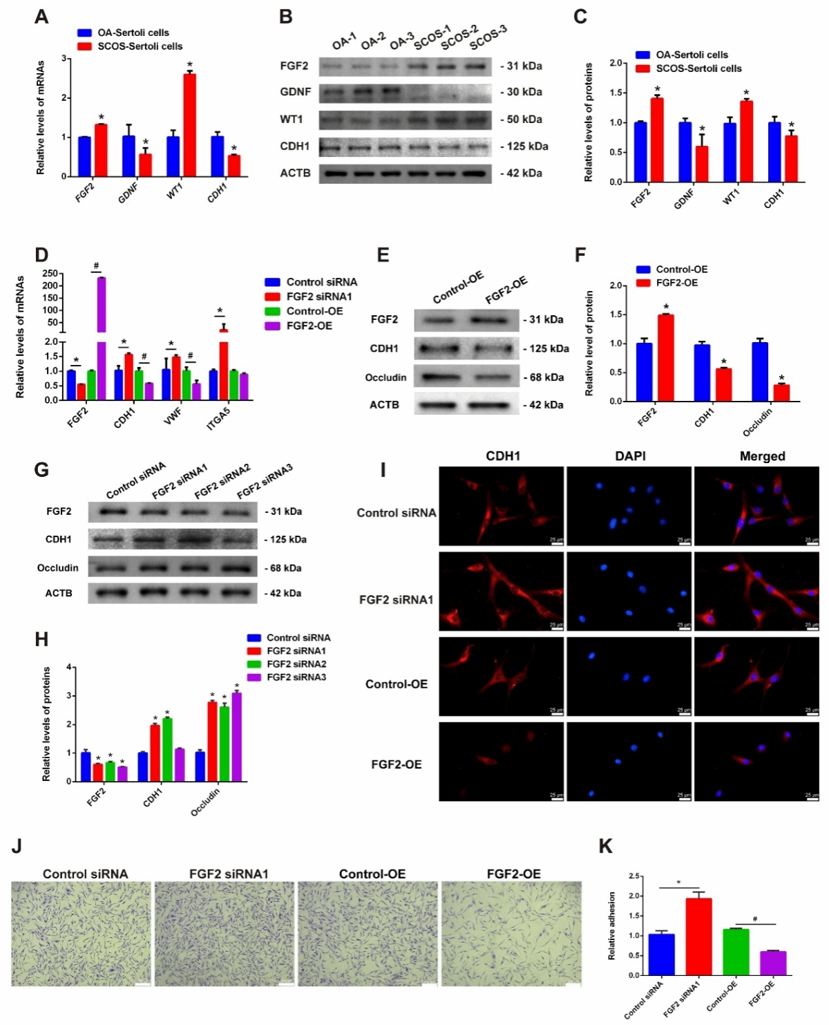 为阐释FGF2在SCOS患者病理过程中的作用机制,我们通过文献挖掘发现FGF2可通过负向调控CDH1表达水平削弱细胞间黏附功能,这一发现与我们的蛋白质组学结果高度吻合,SCOS患者支持细胞中CDH1蛋白表达显著降低。随后,我们观察到人支持细胞中CDH1 mRNA与蛋白在FGF2敲除后升高,而在FGF2过表达时发生降低。进一步细胞黏附实验表明FGF2的表达影响支持细胞的黏附能力,这提示我们FGF2可能通过调控CDH1的表达影响支持细胞的正常功能(图6)。
