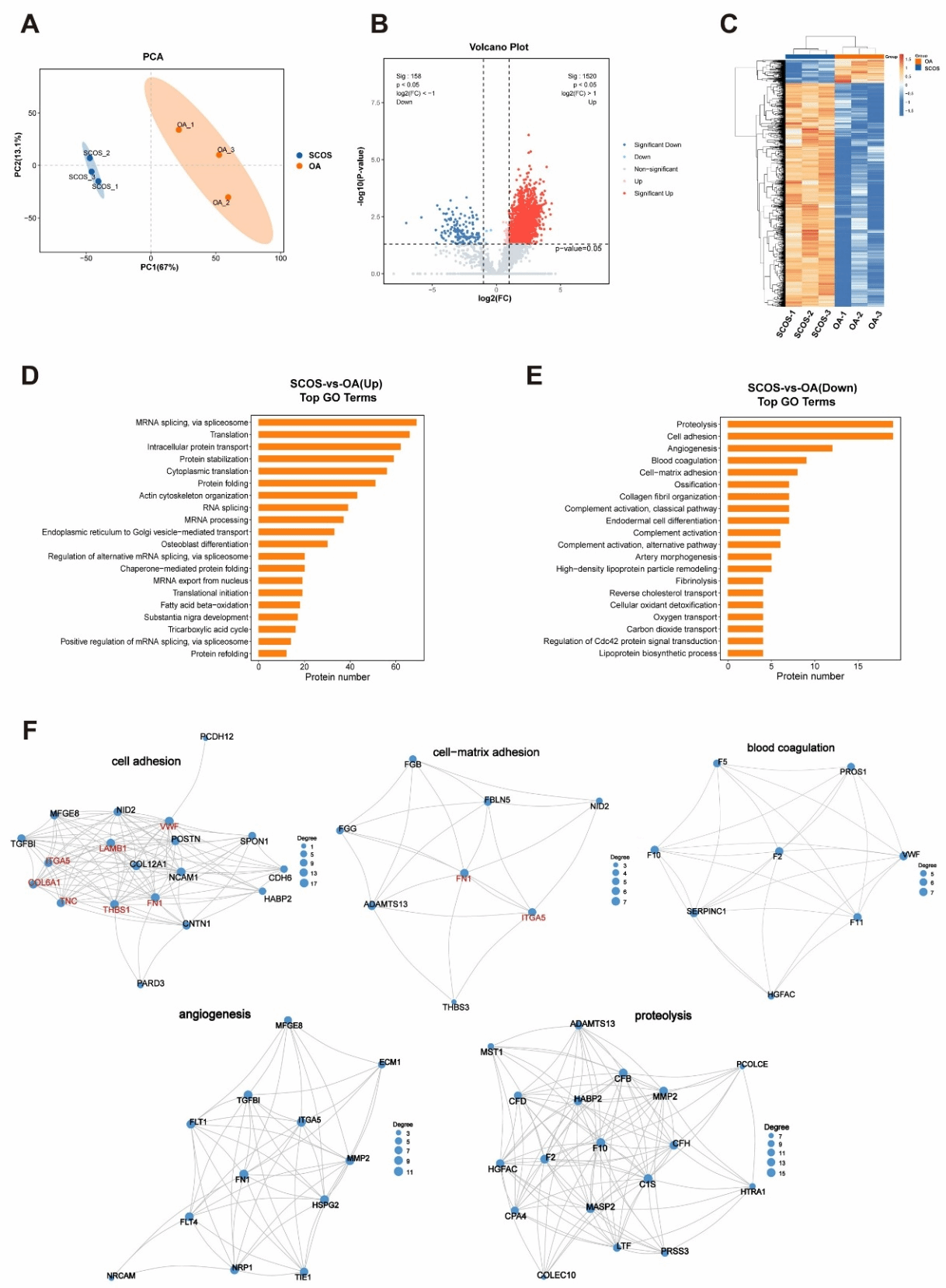 微量蛋白质组学显示,SCOS与OA支持细胞的蛋白质组存在显著差异。火山图显示共有1520个蛋白上调,158个蛋白下调(Fold change≥2.0或≤0.5,p<0.05)。GO分析表明,上调的蛋白主要富集于mRNA 剪接、翻译和细胞内蛋白转运;下调蛋白则集中于细胞黏附、蛋白水解和血管生成(图2)。