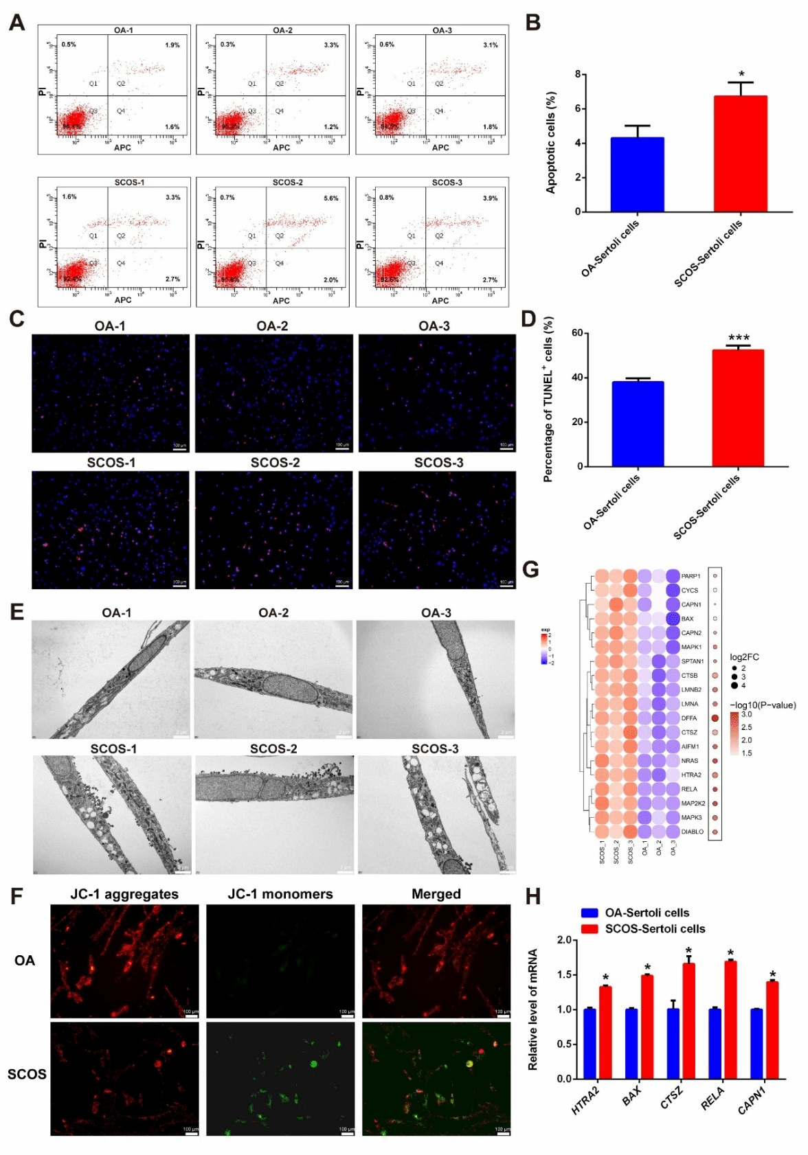随后我们发现SCOS 患者的支持细胞凋亡率明显高于 OA 患者。TUNEL染色和线粒体膜电位检测进一步证实凋亡激活。此外,透射电镜结果显示SCOS 患者的支持细胞表现出明显的内质网扩张,膜裂解增加,凋亡小体增加。GSEA分析显示凋亡相关通路显著富集。以上结果提示,与OA组相比,SCOS患者的支持细胞凋亡显著增加(图7)。