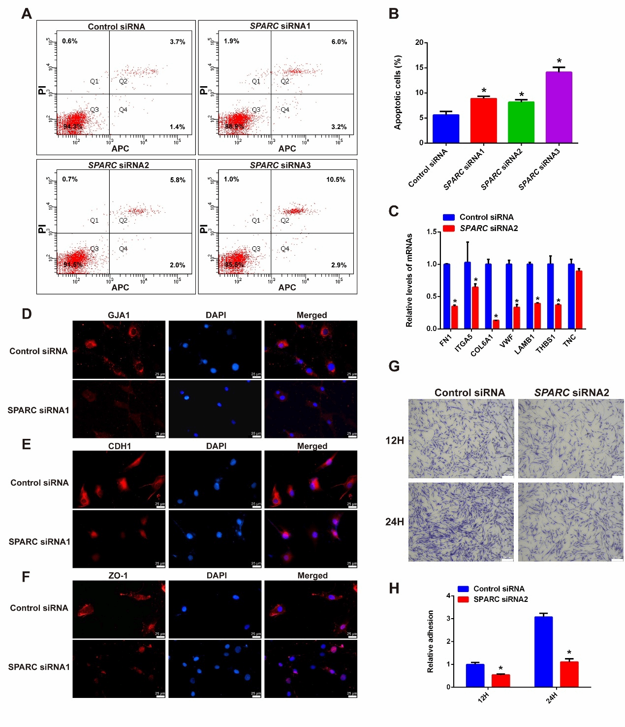 随后,我们探索 SPARC 是否参与调控人类支持细胞的功能。我们发现SPARC敲低可明显增加支持细胞的凋亡并引起细胞黏附能力的下降。SPARC敲低引起ITGA5、COL6A1等黏附相关基因表达下降,并导致紧密连接蛋白ZO-1和钙粘蛋白CDH1的膜定位减弱(图4)。