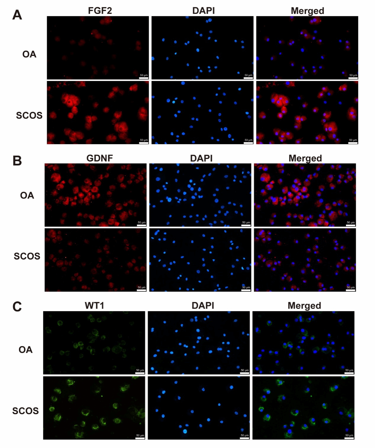通过免疫细胞化学,我们观察到 SCOS 患者的支持细胞中,支持细胞标记物FGF2和 WT1蛋白表达水平显著升高,而GDNF蛋白表达下降(图5)。