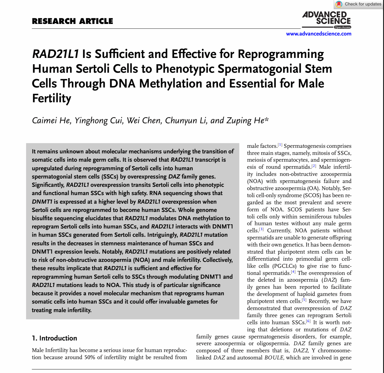 我校生命科学与医学技术学院和海南省医学科学院何祖平教授团队最近在《Advanced Science》发表题为“RAD21L1 Is Sufficient and Effective for Reprogramming Human Sertoli Cells to Phenotypic Spermatogonial Stem Cells through DNA Methylation and Essential for Male Fertility ”的研究论文。