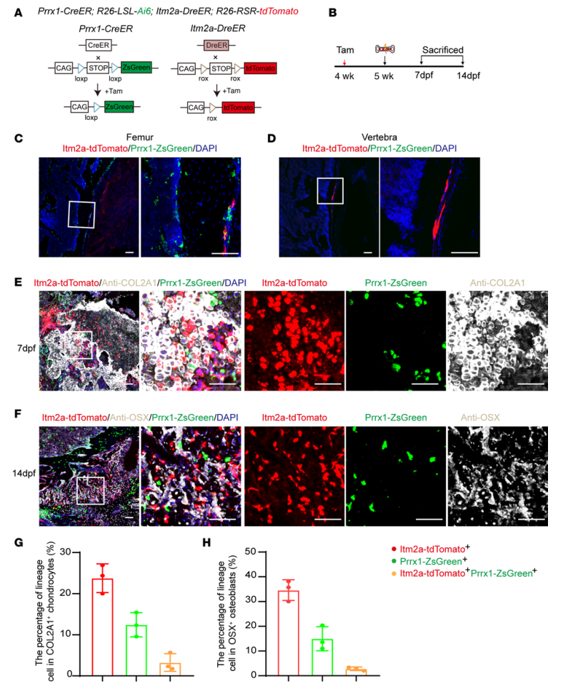 随后,为了追踪这群细胞在骨损伤修复过程中的命运轨迹,研究人员构建了Itm2a-CreER工具小鼠,通过谱系示踪实验发现这群细胞在稳态时能够标记骨外膜中的干细胞类群,并且有更高比例的骨骼干细胞的富集。对通过对Itm2a-CreER工具小鼠进行骨折损伤造模,证明了Itm2a阳性骨膜细胞能够在骨损伤过程产生成骨细胞,软骨细胞和骨髓基质细胞,可以作为参与骨折和骨缺损修复过程的祖细胞。通过构建Itm2a-DreER工具小鼠,和Prrx1-CreER工具小鼠以及Dre/Cre驱动的荧光报告工具小鼠结合,实现Itm2a谱系和Prrx1谱系同时的体内示踪和比较。结果显示Itm2a谱系和Prrx1谱系的骨膜细胞都能够参与骨折损伤修复,但标记了不同的亚群,其中Itm2a谱系的细胞对骨折过程中的软骨和成骨的贡献更高。