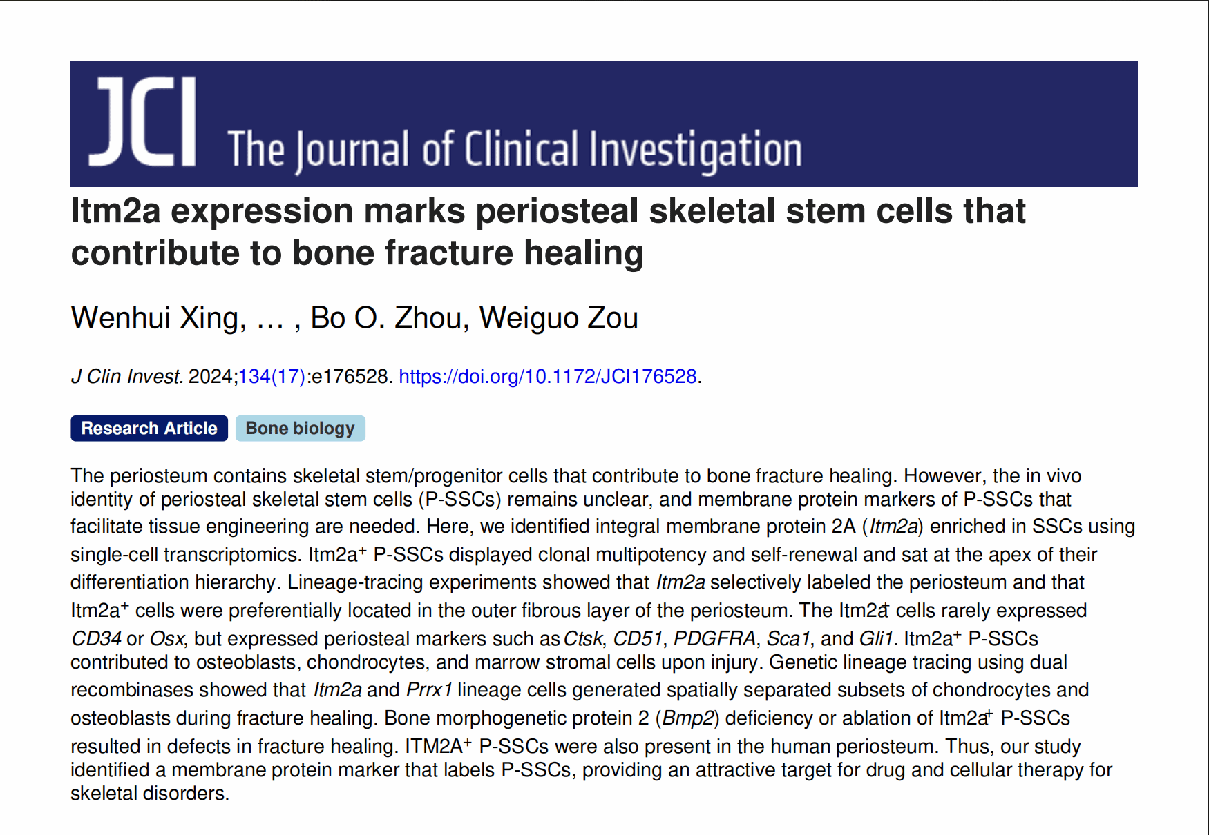 2024年9月3日,邹卫国研究团队在知名国际学术期刊Journal of Clinical Investigation在线发表题为《Itm2a expression marks periosteal skeletal stem cell that contribute to bone fracture healing》的研究型论文。该研究聚焦于参与骨折损伤修复重要细胞来源——骨外膜中的干细胞类群鉴定和功能研究等科学问题,发现整合膜蛋白2A(integral membrane protein 2A, Itm2a)可以标记一群骨外膜上的骨骼干细胞,并且该群细胞能够参与骨折损伤修复。
