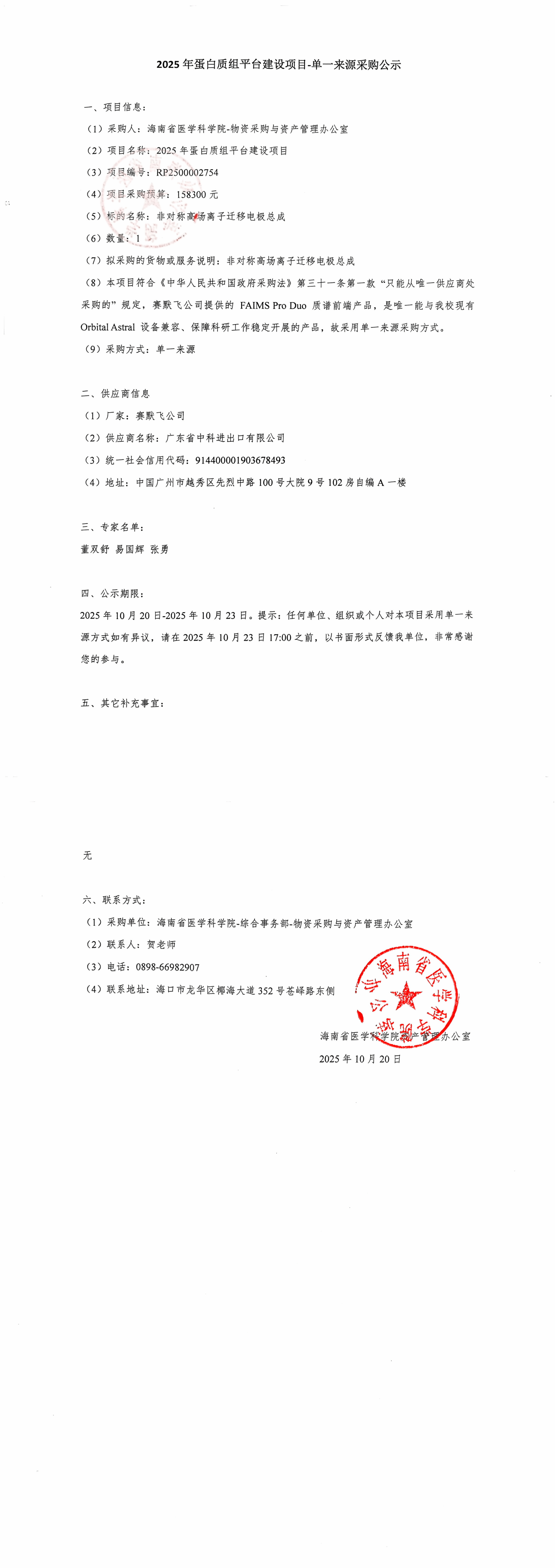 2025年蛋白质组平台建设项目-单一来源采购公示
