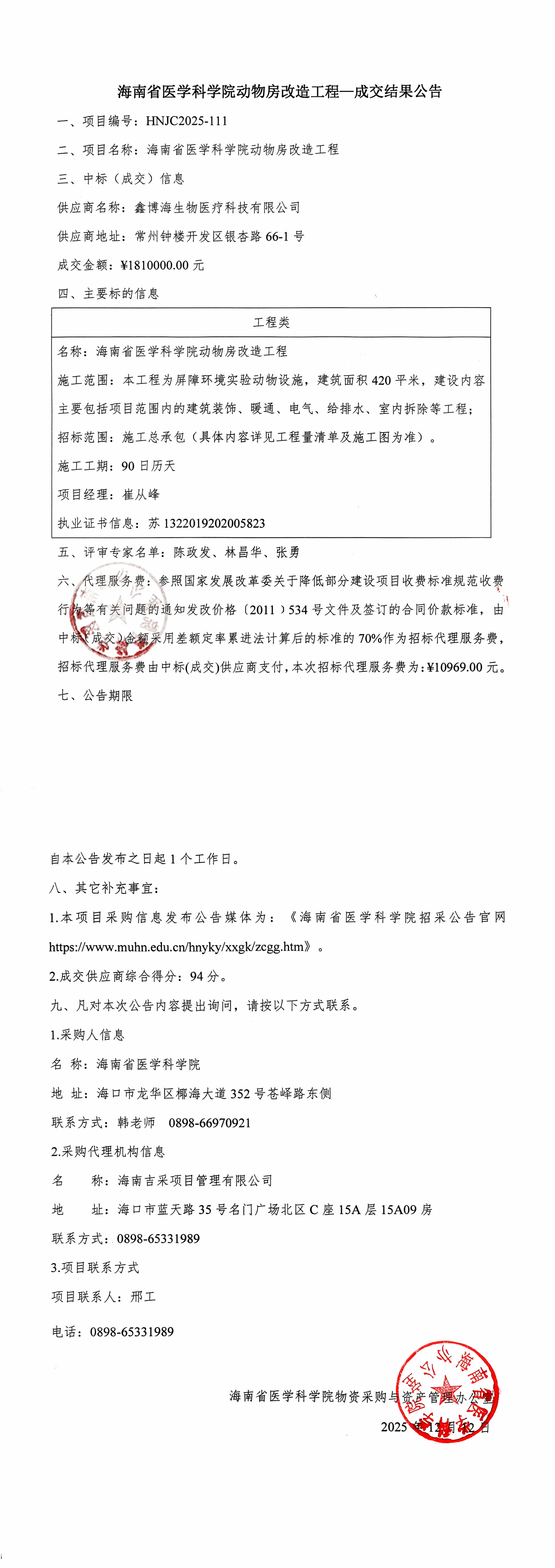 名称:海南省医学科学院动物房改造工程 施工范围:本工程为屏障环境实验动物设施,建筑面积420平米,建设内容主要包括项目范围内的建筑装饰、暖通、电气、给排水、室内拆除等工程; 招标范围:施工总承包(具体内容详见工程量清单及施工图为准)。 施工工期:90日历天 项目经理:崔从峰 执业证书信息:苏1322019202005823 |