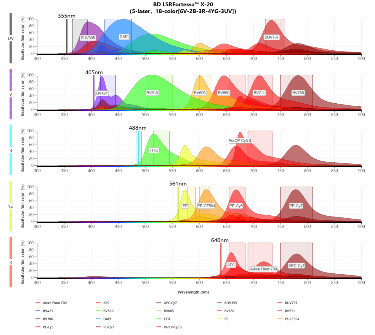 配置 5 根固态高功率激光器,波长包括 355nm、405nm、488nm、561nm 和 640nm,提供灵活的光谱选择,可满足各种荧光染料和抗体的激发需求,实现 5 激光 18 色 20 参数检测。