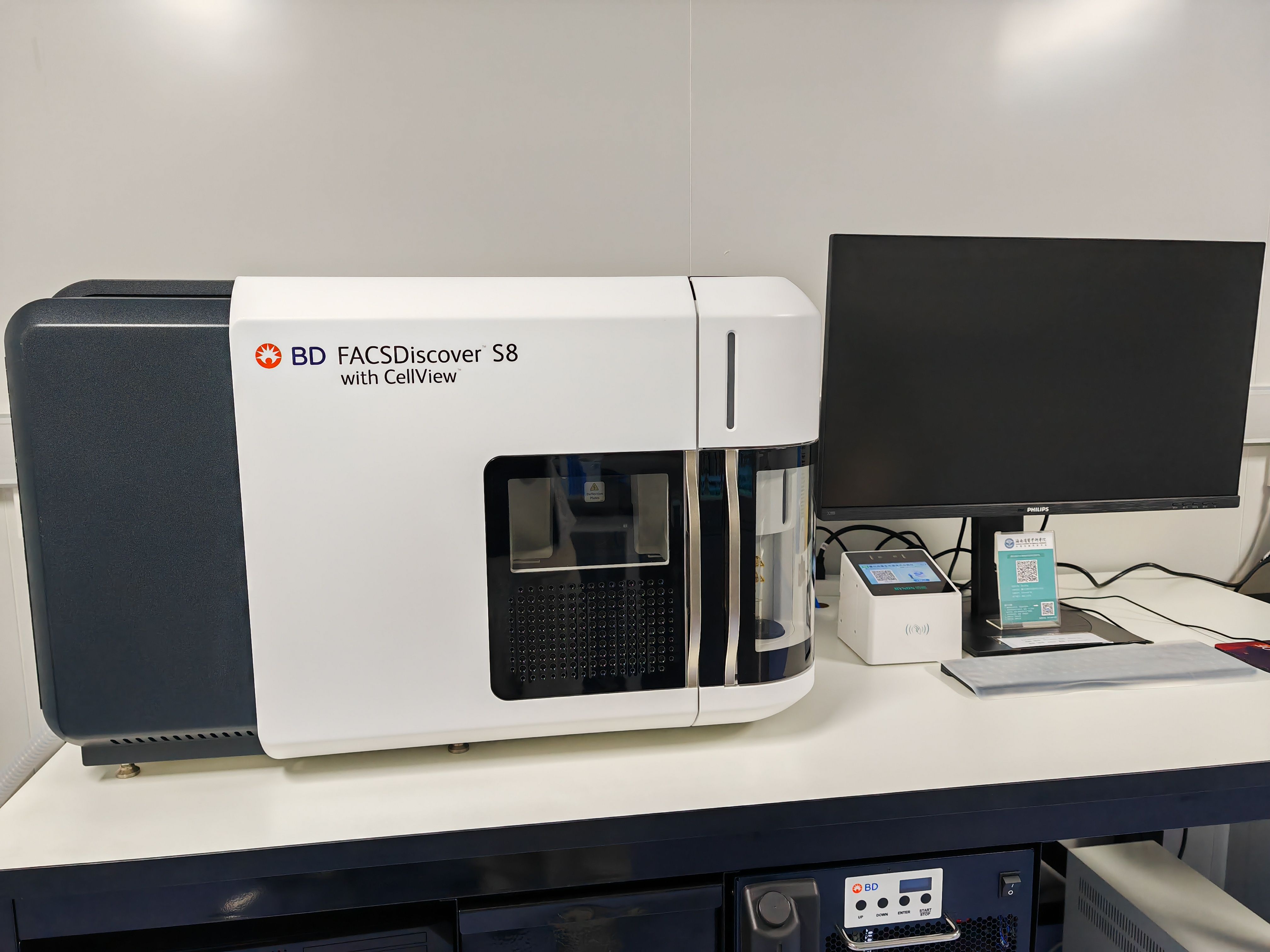 (2) 流式分选仪: 一台 FACSAria Fusion (4激光、13色);一台量化成像全光谱流式细胞分选仪 FACSDiscoverTM S8 (5激光、78个检测通道)。 FACSDiscover™ S8融合高速成像+全光谱流式+自动化分选“3合1”的功能,可检测 78 个荧光通道以及9大空间图像特征参数,为细胞分析提供丰富、全面的数据;CellView™高速图像技术可提供细胞实时图像,有助于直观观察细胞形态,实现更精准的细胞识别、分类和分选,还能揭示荧光信号中的空间信息,实现荧光定位分析,在圈门和分选优化时可借助图像信息,提升分选质量。