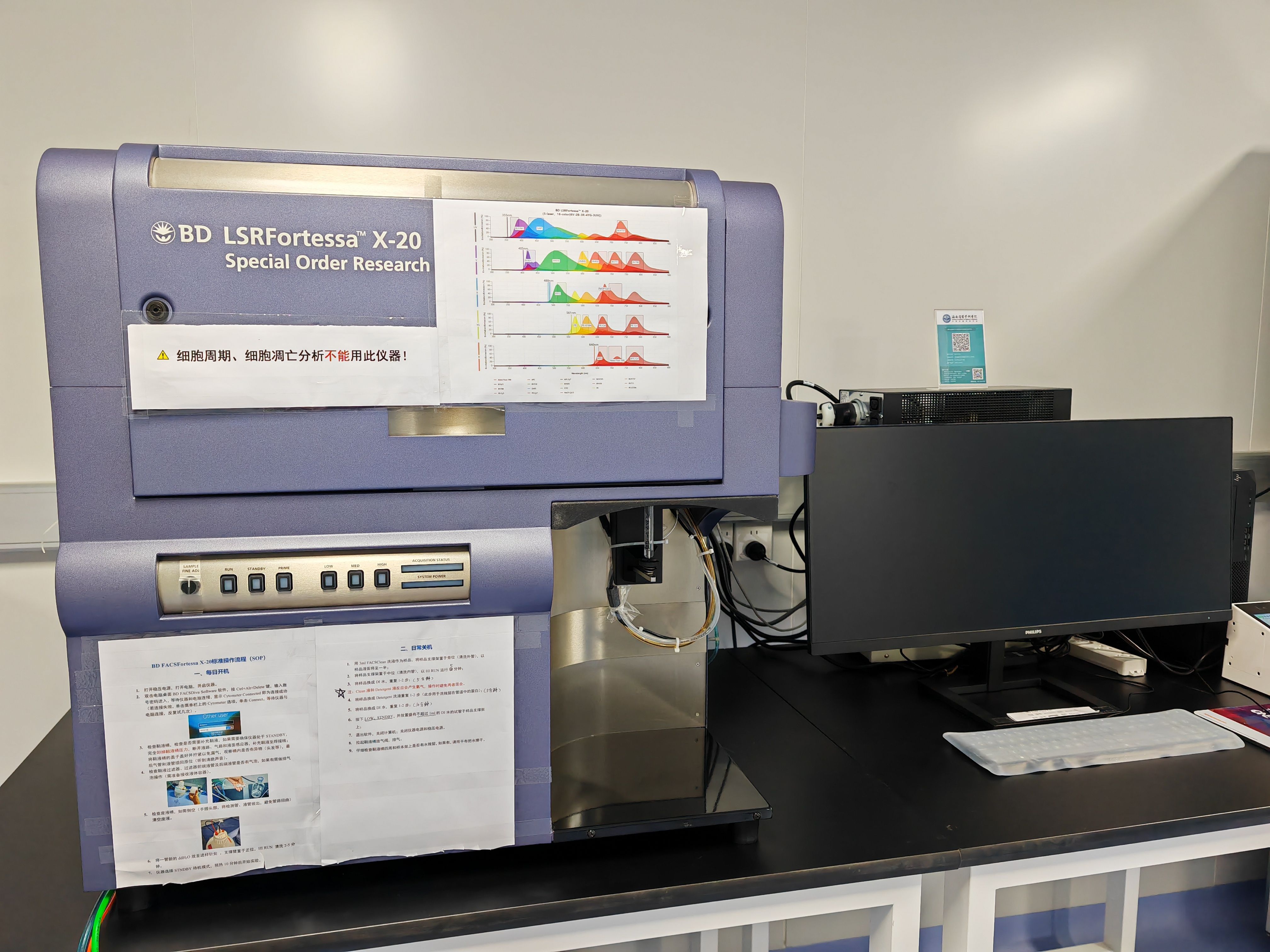 2) 开机前准备工作:检查鞘液桶、废液桶状态,能够正确完成鞘液添加和废液倾倒(防止线路螺旋导致传感器破坏);FortessaX20尤其需要注意检查各处连接是否正确,鞘液桶称重等。