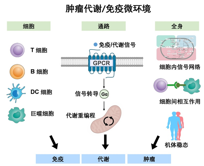 GPCR是人类基因组中最大的膜受体家族,通过感应多种胞外信号分子,调控细胞信号转导,介导广泛的生理反应。GPCR信号异常在肿瘤等人类重大疾病发生发展中扮演了重要作用,然而其调控机制仍不明确。本课题组通过运用单细胞组学,蛋白组学以及基因编辑等前沿生物学技术构建GPCR表型/功能图谱,致力于解析GPCR介导代谢/免疫交互作用促进肿瘤恶性进展的分子机制,为靶向GPCR的抗肿瘤药物开发提供理论基础。