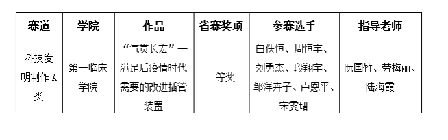 在第十一届“挑战杯”海南省大学生课外学术科技作品竞赛决赛中,经过校级推选、评审委员会复选、决赛答辩评审,我校第一临床学院《“气贯长宏”--满足后疫情时代需要的改进插管装置》参赛作品,获得省赛科技发明制作A类二等奖,取得入围国赛资格。