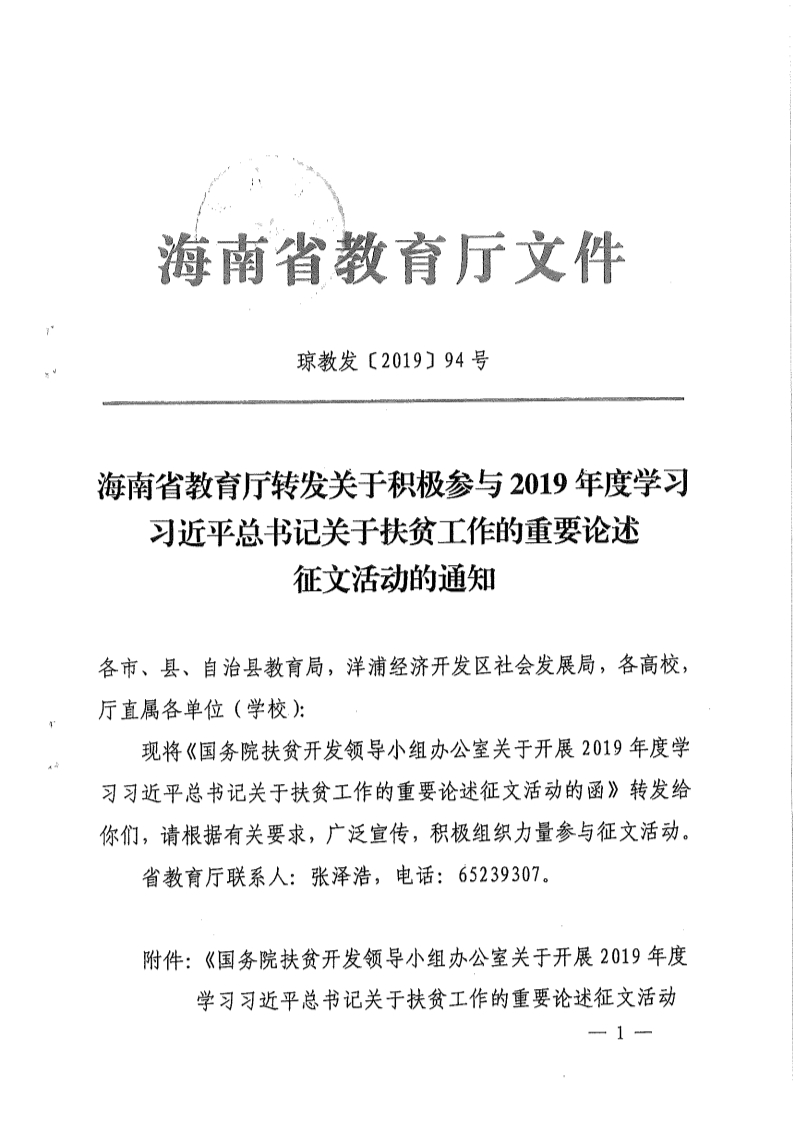 根据省教育厅《转发关于积极参与2019年度学习习近平总书记关于扶贫工作的重要论述征文活动的通知》(琼教发[2019]94号)文件要求,现将《国务院扶贫开发领导小组办公室关于开展2019年度学习习近平总书记关于扶贫工作的重要论述征文活动的函》转发给你们,请根据有关要求,广泛宣传,积极组织力量参与征文活动。