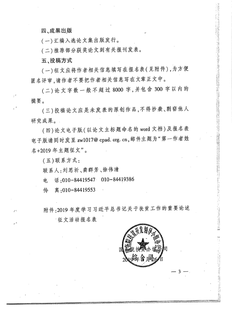 参选论文征文电子版及征文活动报名表电子版请同时、直接发送到全国扶贫宣传教育中心,电子邮箱:zw1017@cpad.org.cn。征文活动报名表详见附件2。