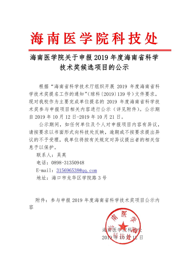 附件:参与申报2019年度海南省科学技术奖项目公示内容