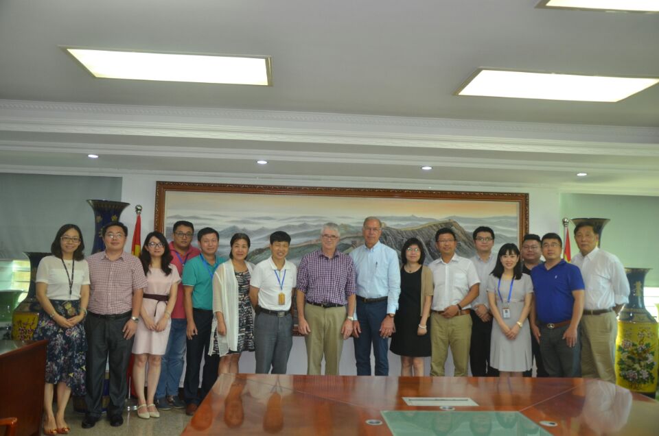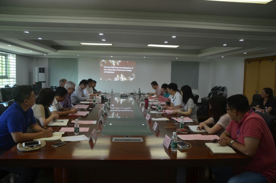与美国佛蒙特大学医学院座谈会在行政楼第一会议室举行。佛蒙特大学医学院副院长、佛蒙特医疗集团总裁兼CEO克劳德.迪尚,集团总财务官哈沃德.斯切必若,上海复星医院投资集团副总裁沈涵、集团财务投资总监邬丹,美国M﹠L生物咨询公司副总裁孟路,省发改委社会处处长杨军、处长助理徐宇杰,省卫计委产业处符勋,我校黄元华副院长以及宣传部、交流合作处、人事处、科技处、教务处、第一、二临床学院负责人参加座谈。座谈会由交流合作处副处长李果果主持。