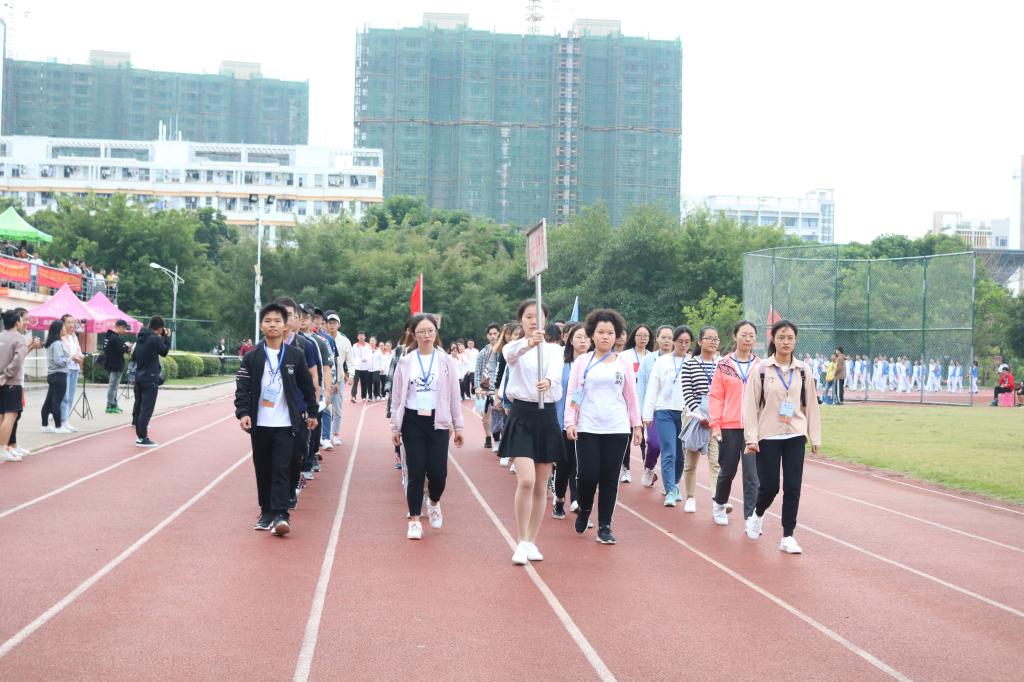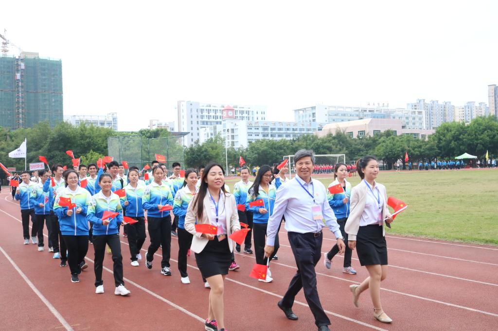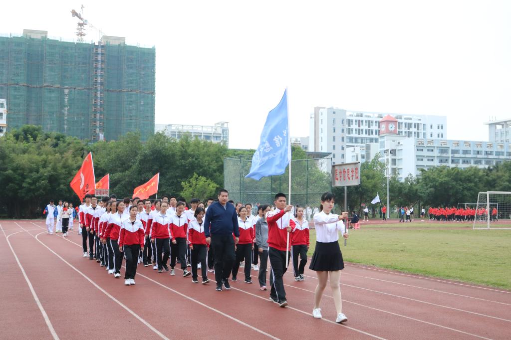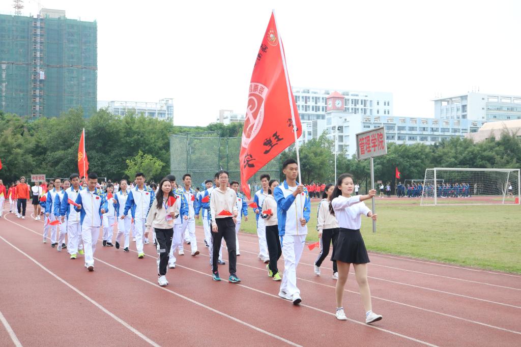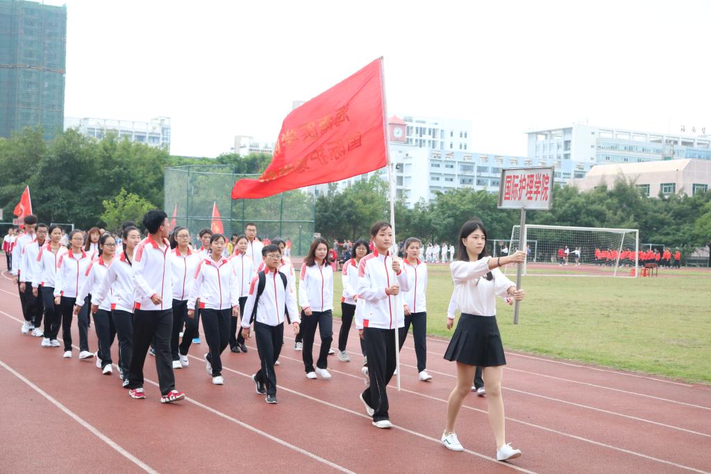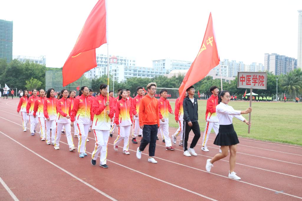 首先迈着矫健的步伐进入会场的是国旗护卫队,他们飒爽英姿,郑重而庄严地高擎旗帜,迈着坚定的步伐,向我们走来。紧接着是本次运动会严肃认真公平公正的裁判员队伍,接下来各学院与工会运动员代表依次入场(国际护理学院代表队、医学信息学院代表队、管理学院代表队、中医学院代表队、基础医学与生命科学学院代表队、口腔医学院代表队、药学院代表队、热带医学与检验医学院代表队、公共卫生学院代表、高等职业教育学院第一代表队、高等职业教育学院第二代表队、第一临床学院第一代表队、第一临床学院第二代表队、第二临床学院代表队、急诊创伤学院代表队、国际教育学院代表队、研究生院代表队、机关工会代表队、基础工会代表队、第一附属医院工会代表队、第二附属医学院工会代表队、附属海南医院代表队、附属肿瘤医院代表队、海南省安宁医院代表队、海南省妇幼保健院代表队)。他们以整齐划一的步伐向我们展现了运动员的朝气蓬勃,同时也向我们展示了运动员的自信与热情。