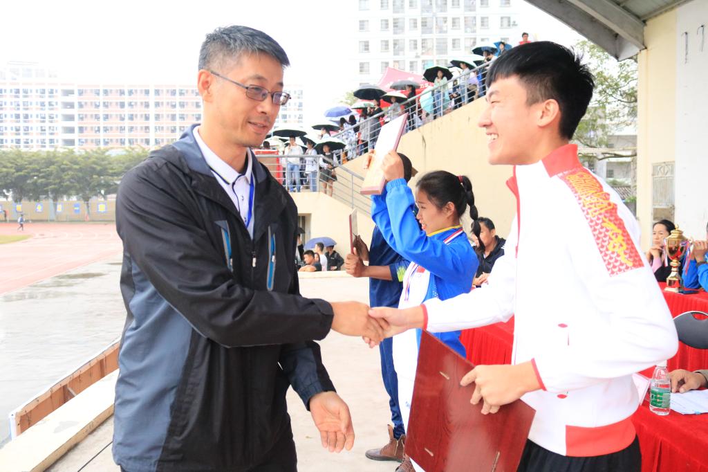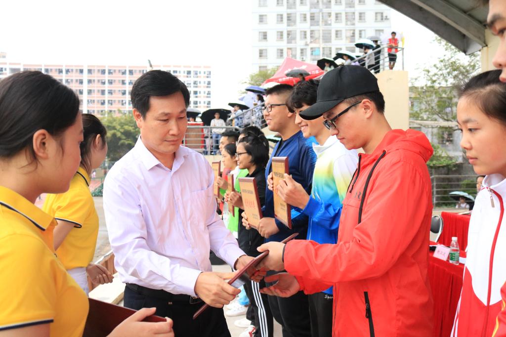 我校第十五届田径运动会于11月25日下午在学校城西校区田径运动场圆满落幕!学校党委副书记、纪委书记谢江波,孙晓宁副校长、附属海南医院单明华副院长、附属安宁医院党委副书记陈文涛、附属肿瘤医院刘韦淞副院长等领导,校职能部门负责人,各二级学院党委书记和院长共同出席了闭幕式。