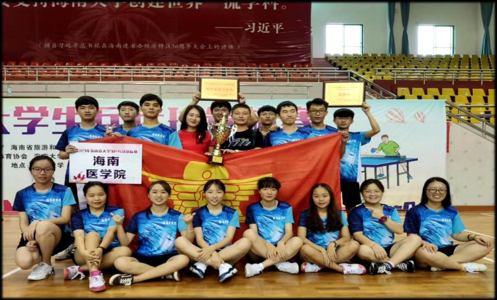 5月9日,2019年海南省大学生乒乓球锦标赛在海南大学联谊馆落幕。我校学生乒乓球运动队在比赛中展现出了海医学子顽强拼搏、团结向上的精神面貌,经过三天紧张激烈的比赛,夺得了女子团体比赛冠军,这是我校首次问鼎该项赛事团体冠军。同时,我校在单项比赛中也取得了优异成绩:女子单打冠军,混合双打第二名、第三名,男子双打第三名。并荣获“体育道德风尚奖”称号。