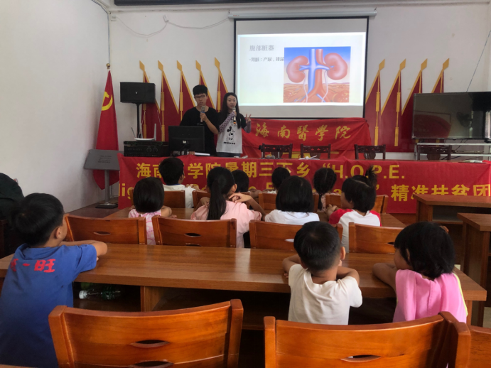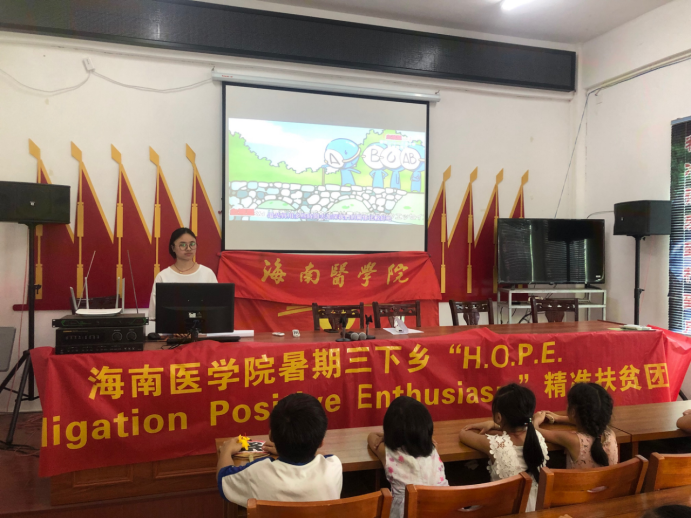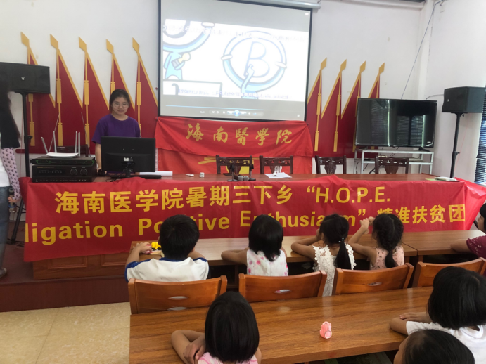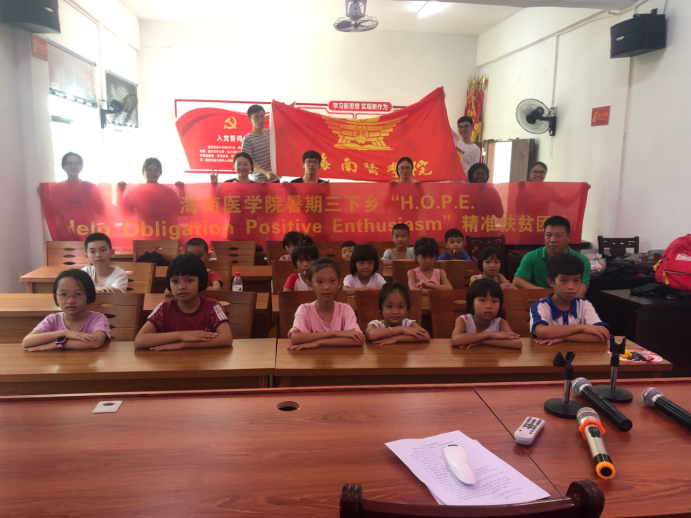 “H.O.P.E”扶贫团队在此次扶贫实践活动中与服务群众相结合、与专业实践相结合、与时代精神相结合,深入乡镇、农村、学校等基层一线,向贫困地区的青少年儿童推广普及国家精准扶贫政策及卫生健康教育、实地考察、赠予学习生活相关用品、开展医疗知识科普教育及英语辅导,真正做到在实践中求学问、在实践中增才干、在实践中求发展。该团队秉承海医“厚德严谨,博学和谐”的美德,加强