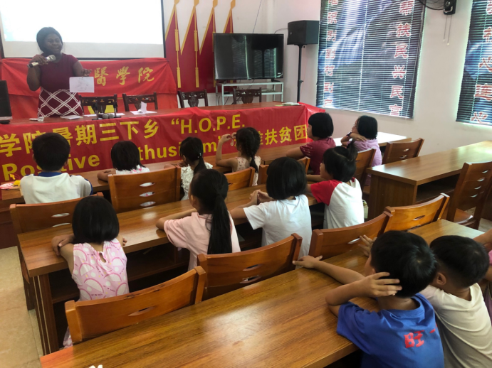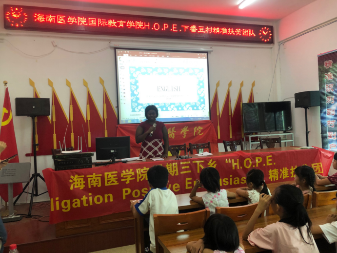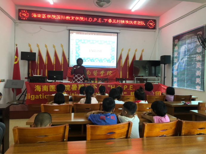 “H.O.P.E”扶贫团队的大学生党员协助完善了中共中央乐东黎族自治县抱由镇番豆村支部委员会的党建工作、党务工作会议记录,参观学习了党员发展规划、目标,入党积极分子培养计划,发展党员工作会议记录和党建工作半年总结及年度工作总结,并在此过程中获益匪浅。除此之外,在村党支部书记、村委会主任以及我院党员田丰老师的带领下,全部党员和预备党员进行了重温入党誓词活动。同时,该团队的大学生志愿者们不仅利用自己的专业知识给孩子们进行了基础医学知识的科普,且利用村文化中心的多媒体设备与孩子们共度了轻松快乐的艺术课堂和课间时光。另外,来自喀麦隆的留学生安妮带来了生动形象的英语课堂,教授了英语单词、歌曲及日常口语,激发了同学们的英语学习兴趣。伴随着孩子们的欢声笑语,扶贫、扶智活动告一段落。