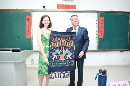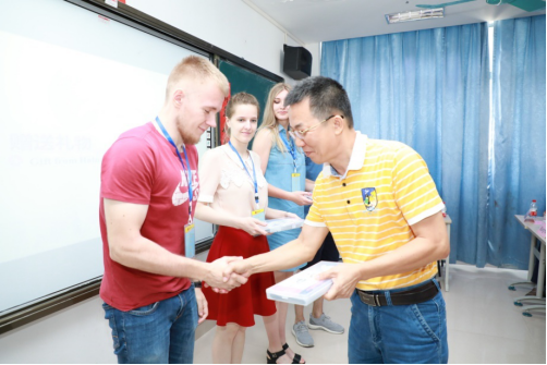 随后,吕传柱书记向俄方高校教师代表赠送了具有海南特色的黎锦;邝家旺处长向学生代表赠送书法礼盒。全体人员在实验楼前合影留念。
