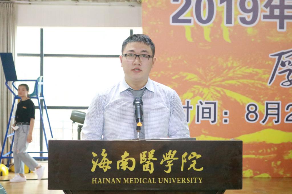 第一临床学院2019级临床医学卓越八班的新生周凯同学代表新生发言,作为一名刚刚踏入大学校园的学生,立志成为新时代的“扁鹊”。他说,学习医学就好像进行射箭比赛,必须摆出正确的射箭姿势,才能直中靶心,一矢中的。大学的求知路上依旧是艰苦而漫长的,绝不是鲜花一片,更不是坦途无限。他希望2019级新生能通过自己的努力与拼搏,成为神州“能医手”,为人民服务,为海南自贸区建设贡献自己的力量!