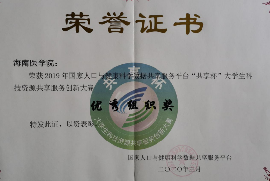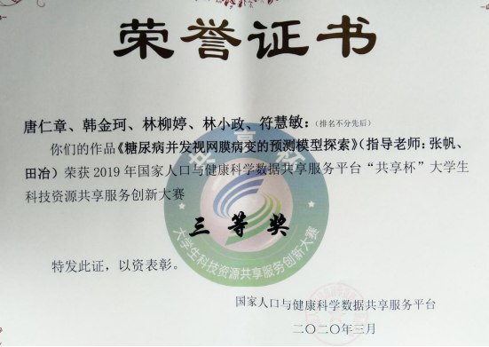 在近日结束的第七届“共享杯” 大学生科技资源共享服务创新大赛中,我校荣获2019年国家人口与健康科学数据共享服务平台“共享杯”大学生科技资源共享服务创新大赛“优秀组织奖”,公共卫生学院硕士团队与中医学院中医本科生团队的两件作品均荣获“三等奖”。两项获奖作品分别为唐仁章、韩金珂、林柳婷、林小政、符慧敏的《糖尿病并发视网膜病变的预测模型探索》指导老师张帆、田冶;与陈秀香、陆瑶、尧明慧、赛俊婷、高艺媛的《针灸研究对癌痛的镇痛作用》指导老师宫爱民。