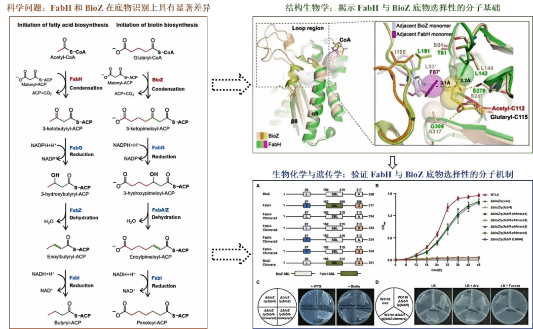 β-酮酰-酰基载体蛋白(ACP)合成酶是碳链延伸过程中的关键酶,能够催化酰基-CoA或酰基-ACP与丙二酰-ACP缩合生成β-酮酰-ACP。其中,两个同源酶FabH(β-酮酰基-ACP合酶III)与新近鉴定的BioZ分别负责启动细菌脂肪酸和生物素的生物合成途径。FabH主要利用乙酰-CoA作为引物底物,而BioZ则特异性识别带有带电ω-羧基的较长底物—戊二酰-CoA。尽管两者催化机制相似,但其严格底物特异性的分子机制尚不明确。