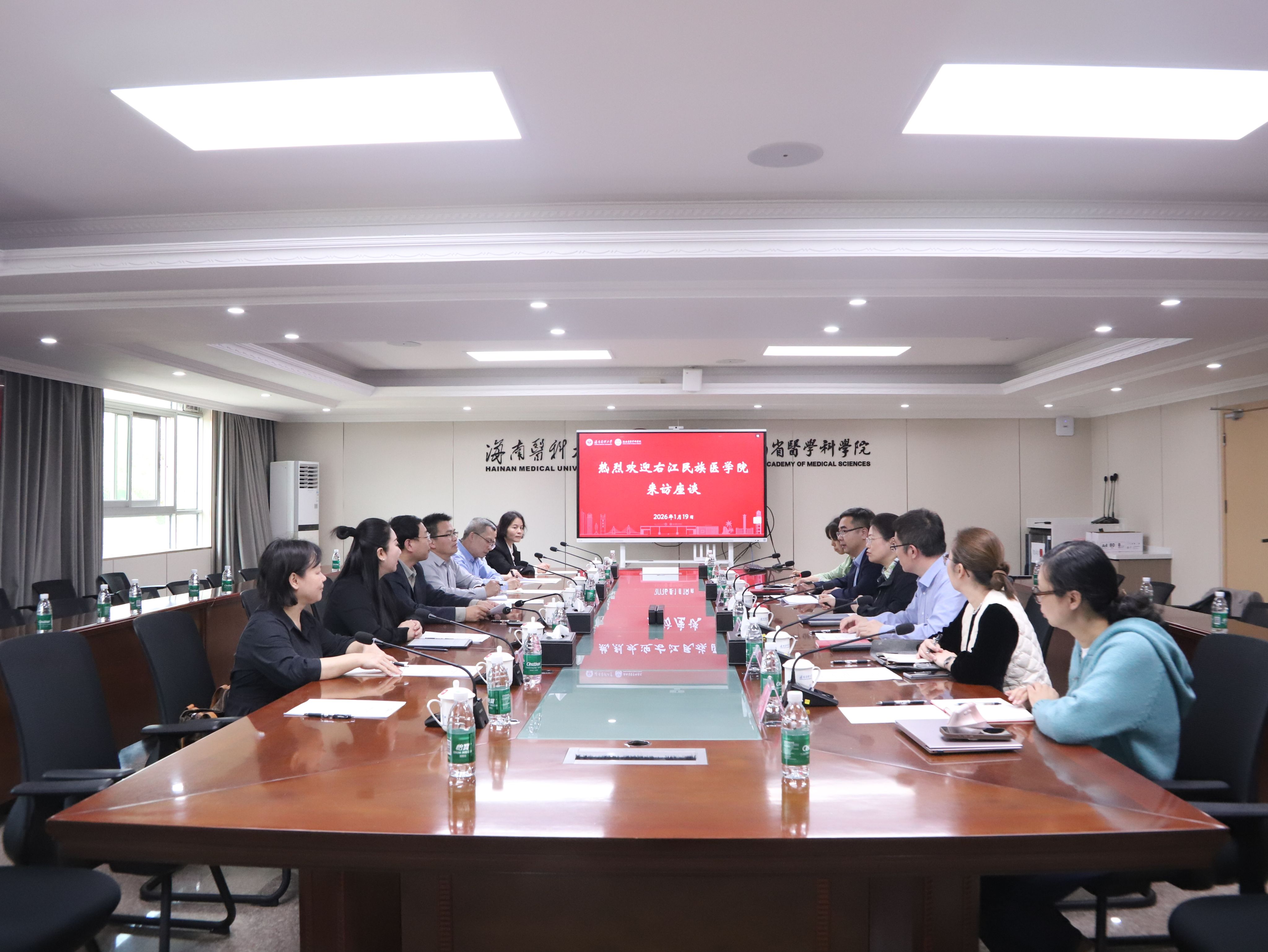 1月19日下午,右江民族医学院党委常委、副校长王俊利率队到访我校,就医学教育发展相关议题进行交流研讨。我校副校长曾敏主持座谈会,两校教务处等职能部门及临床医学院负责人共同参会,围绕医学教育改革、专业认证、教学管理等核心议题深入交流,共商合作发展大计。
