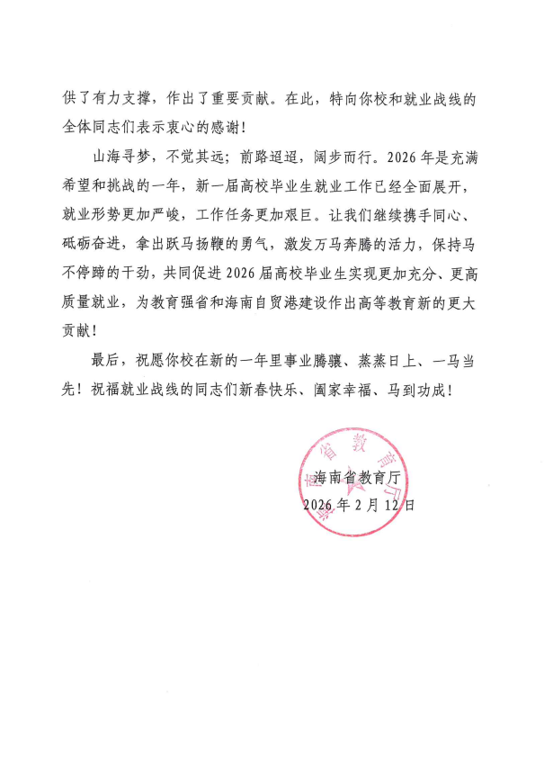信中指出,2025年,我校坚决贯彻上级决策部署,将毕业生就业工作置于学校发展的突出位置,严格落实就业工作“一把手”工程,学校领导亲自部署、统筹谋划、靠前指导,学生工作部与就业战线全体同志凝心聚力,多措并举开展就业工作。我校“雨露计划”毕业生、残疾毕业生等困难毕业生全部提前落实毕业去向、留琼率保持高位、灵活就业率明显下降,就业质量迈上新台阶。