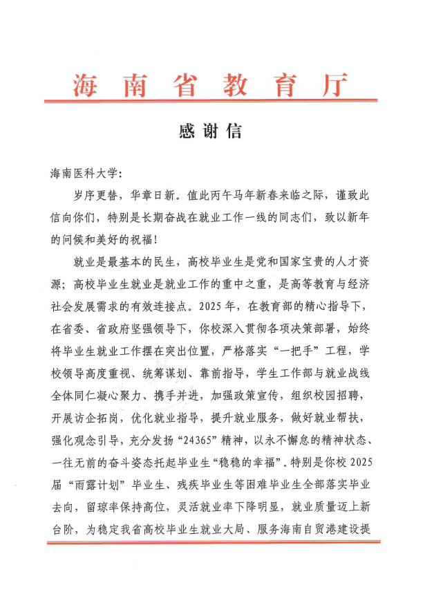 这封感谢信,既是对过往成绩的诚挚肯定,更是对未来征程的深切期许。学校将把这份沉甸甸的肯定转化为工作动力,持续将毕业生就业工作摆在突出位置,不断提升就业服务水平与人才培养质量,策马扬鞭,勇担使命,为海南自贸港建设和医疗教育事业发展贡献更坚实的海医力量!