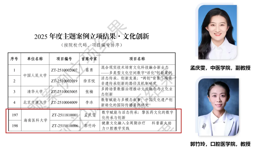 “文化创新”领域,以数字技术赋能黎医药非物质文化遗产保护传承,探索民族医药文化活态发展路径;同时构建“临床诊疗-健康科普”一体化服务模式,助力口腔健康服务升级。