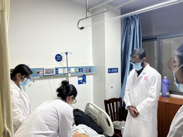 留学生床旁为病人做体格检查