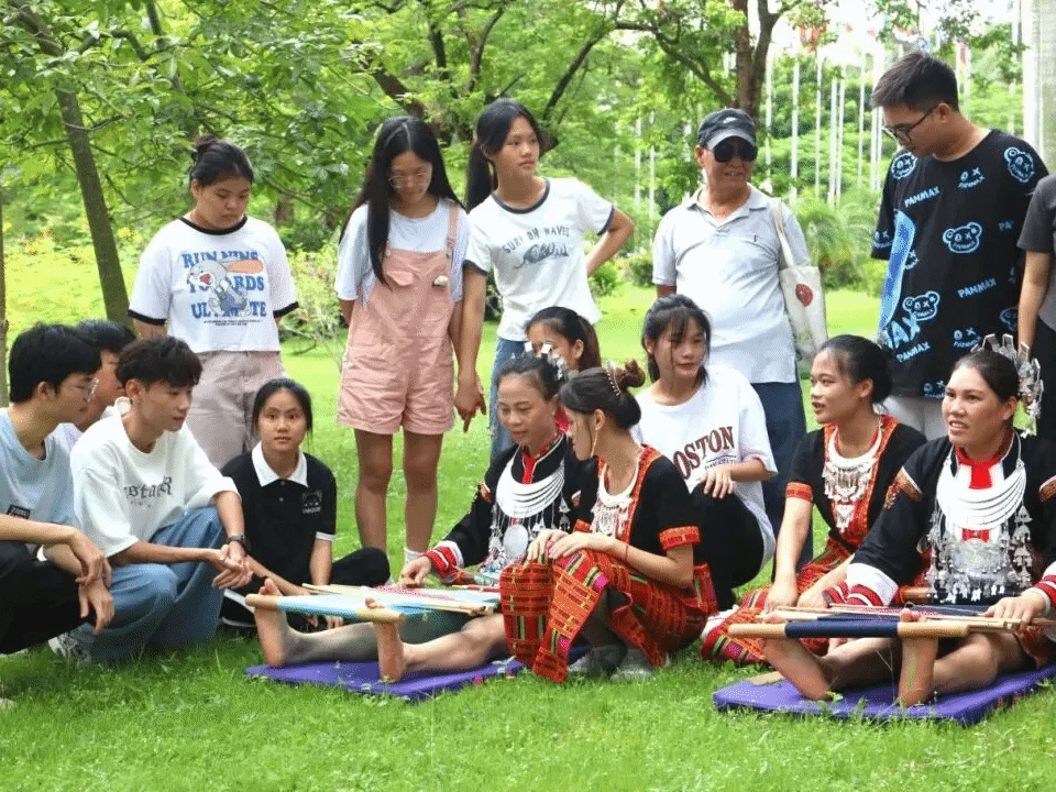 学校构建覆盖专业实践基地、非遗传承基地、思政教育基地等的五育实践体系,将思政教育植入学生喜闻乐见的劳动体验与身心成长活动中。在南药种植基地、蔬果种植基地,学生通过翻土播种、采收炮制的劳作实践,体悟“一分耕耘一分收获”的奋斗精神;在“八段锦减压角”,师生共练传统功法,在呼吸吐纳间感受传统文化的生命智慧;黎歌合唱团用多语言演绎黎族歌谣,手绘艺术基地让学生以画笔定格红色故事;学校也建立了包括前文提到的“黎锦织造”“藤竹编”等非遗技艺实践基地——这些“上手实践+文化体验”的模式,打破了思政教育的刻板印象,让学生在沉浸式参与中自然理解“工匠精神”“文化传承”的深刻内涵。赴西班牙交流时展示的黎锦编织、藤竹编技艺,均是学生作品,不仅被中国驻巴塞罗那领事馆收藏,更让青年在跨文化对话中坚定“以文化人、以文育人”的自信,完成从“认知认同”到“实践输出”的成长蜕变。