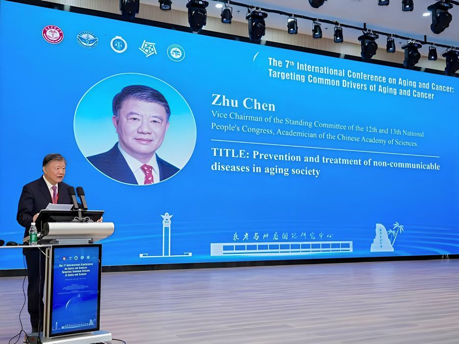 调研当日,陈竺院士在海南医科大学立言厅参加由海医与美国塞缪尔·魏克斯曼癌症研究基金会及上海交通大学医学院附属瑞金医院共同主办的第七届衰老与肿瘤国际学术会议,并以《老龄化社会的慢性非传染性疾病防控》为题作大会主旨报告。他指出,在人口快速老龄化的背景下,心脑血管疾病、癌症、糖尿病和慢性呼吸系统疾病等四大慢性非传染性疾病的防控形势依然严峻。我国正通过加强基础与临床研究、推动早筛早诊、完善分级诊疗、倡导健康生活方式等综合策略,力争在2030年前将四大慢病导致的过早死亡率较2015年水平降低30%,实现“健康中国2030”目标。