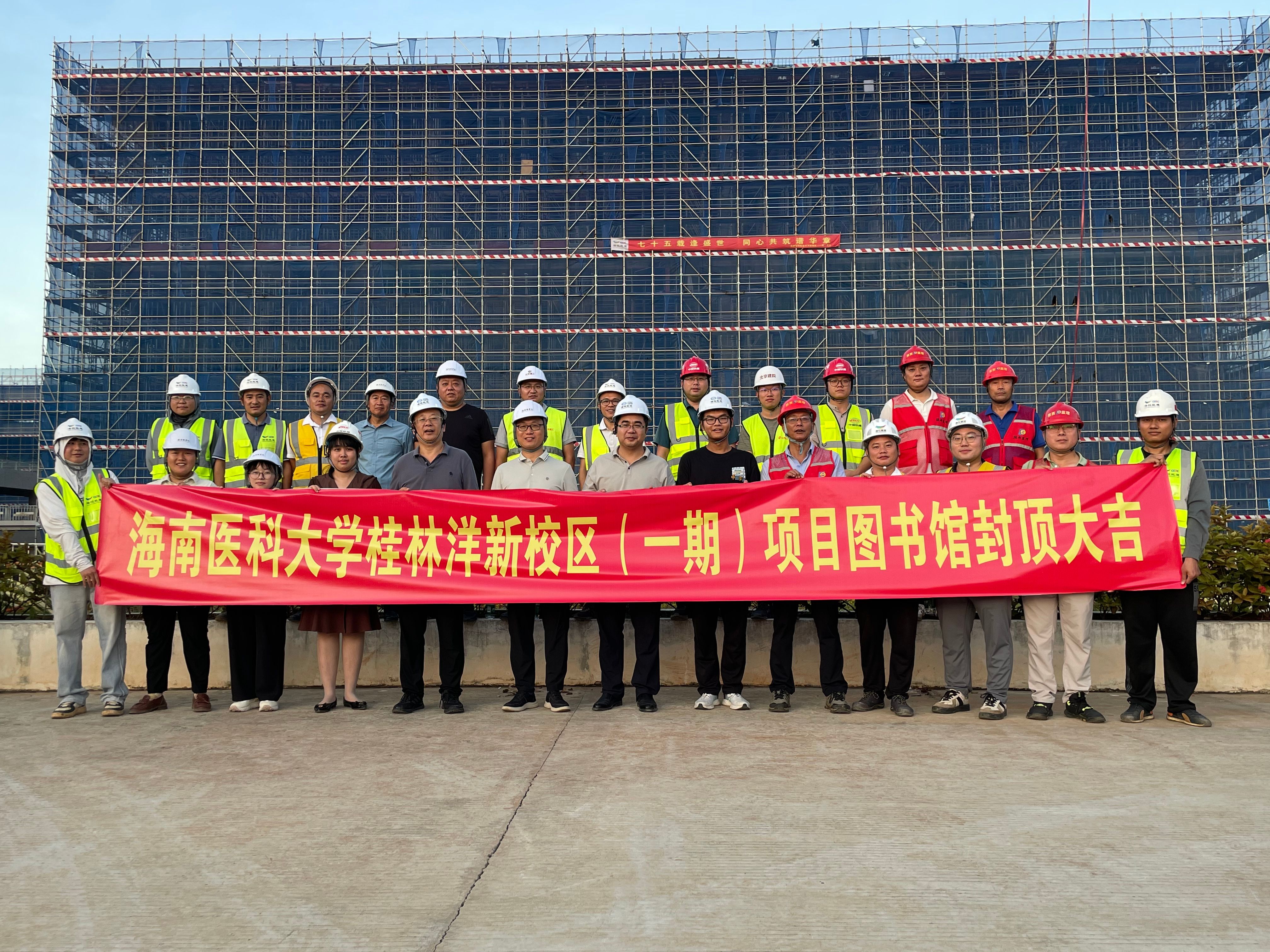 11月1日,海南医科大学桂林洋新校区(一期)项目建设工地彩旗飘飘,一派节日气氛,图书馆标志性建筑项目正式封顶。图书馆项目位于新校区中心位置,主体7层,面积约16000平方米。顺利封顶是参建各方密切配合、辛勤付出、攻坚克难的结果,为新校区一期工程按期竣工投入使用奠定了坚实的基础。