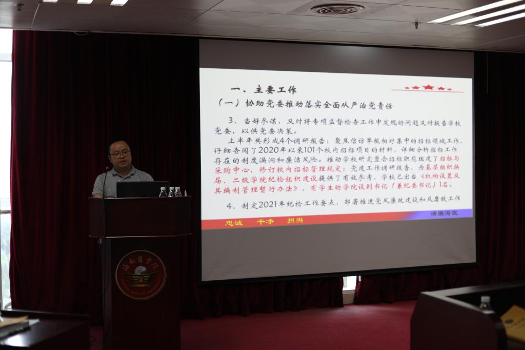 会上,纪检监察一处副处长颜剑波同志对上半年全校纪检工作进行了全面总结,通报了部分单位在党风廉政建设等工作中好的做法并就下半年如何开展纪检工作进行了安排部署;纪检监察二处何敬熊同志对上半年重点领域关键环节监督事项报备工作情况进行了通报,就下一步重点领域关键环节日常监督工作进行了详细讲解并提出要求;纪检监察一处孝显柱同志就《