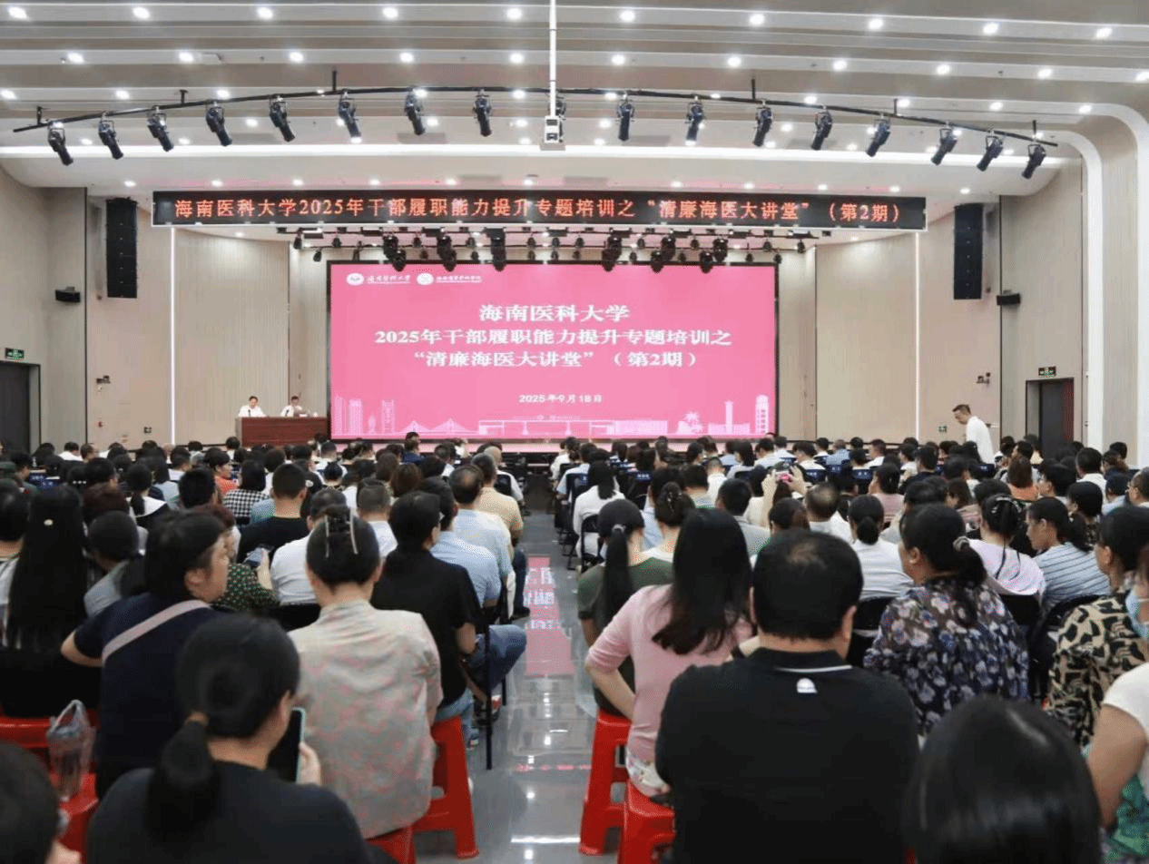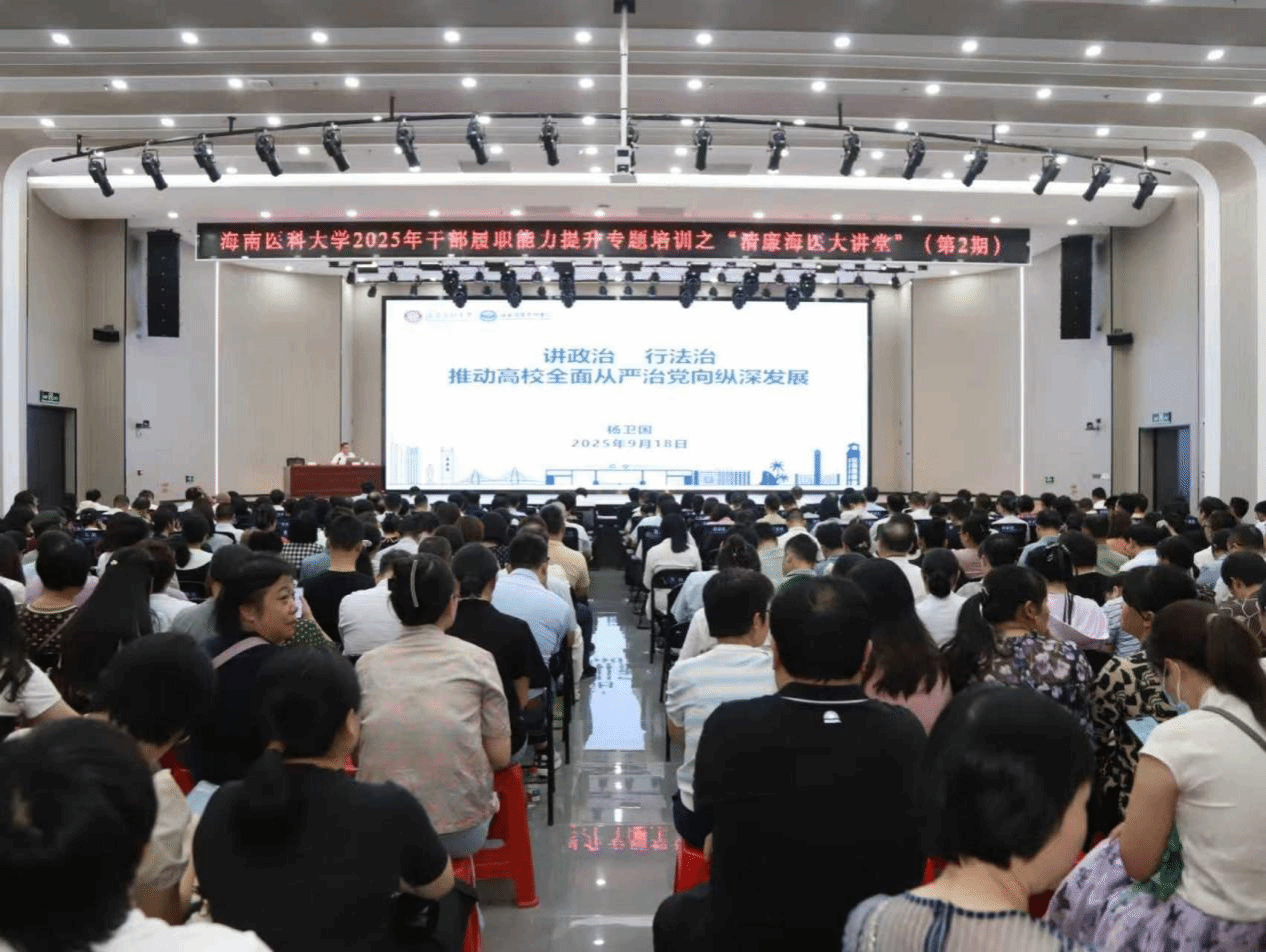 9月18日下午,由学校党委主办的“清廉海医大讲堂”第二期讲座在城西校区立言厅举行。本期讲座属于2025年干部履职能力提升培训班的重要组成部分,由学校纪委书记、监察专员杨卫国作专题报告,学校党委副书记张巍主持。学校党委书记张彩虹,副校长邹卫国、曾敏、贾彬、黄斌文、丁治国,党委常委谢毅强、雷浩泽等出席报告会。