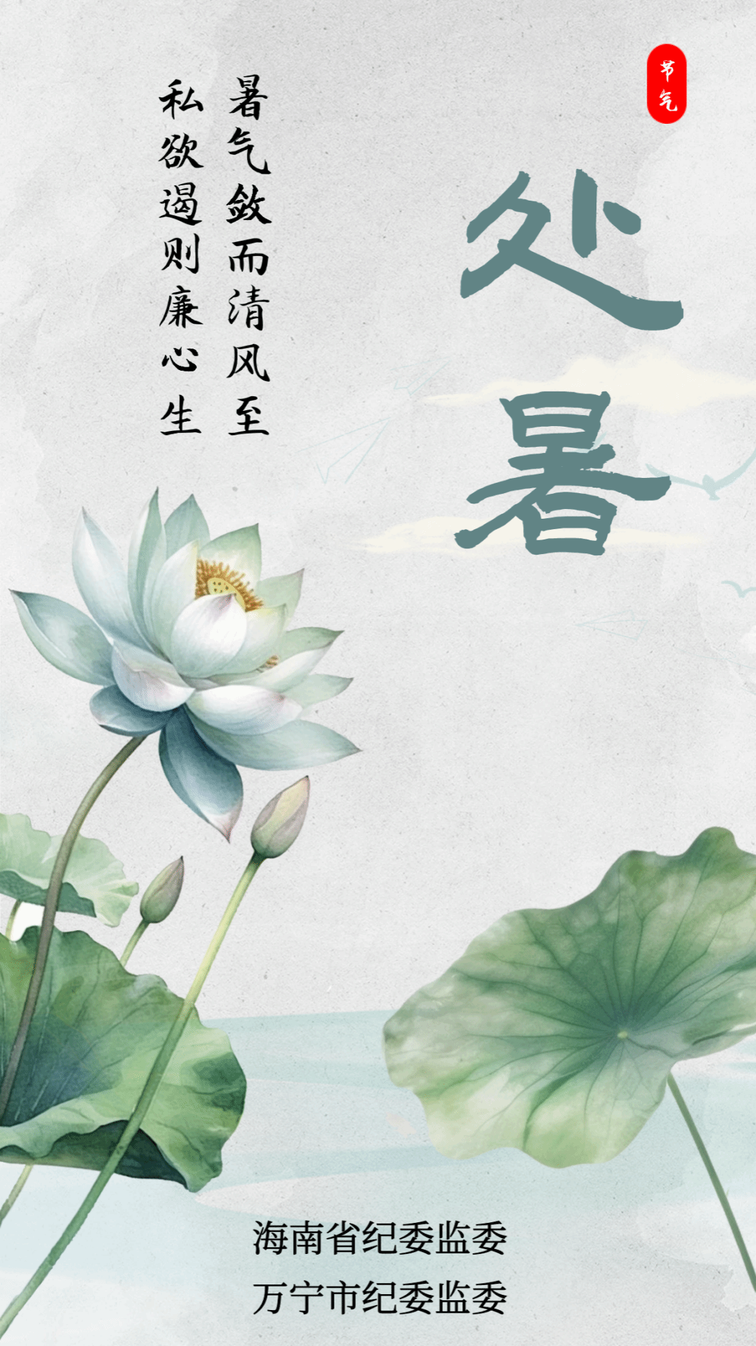暑气敛而清风至,私欲遏则廉心生。处暑将至,昼暖夜凉温差显著,党员干部须保持“热退凉生”的政治清醒,模范践行中央八项规定精神,以严于律己的作风规范权力运行,为海南自由贸易港绘就清廉底色。