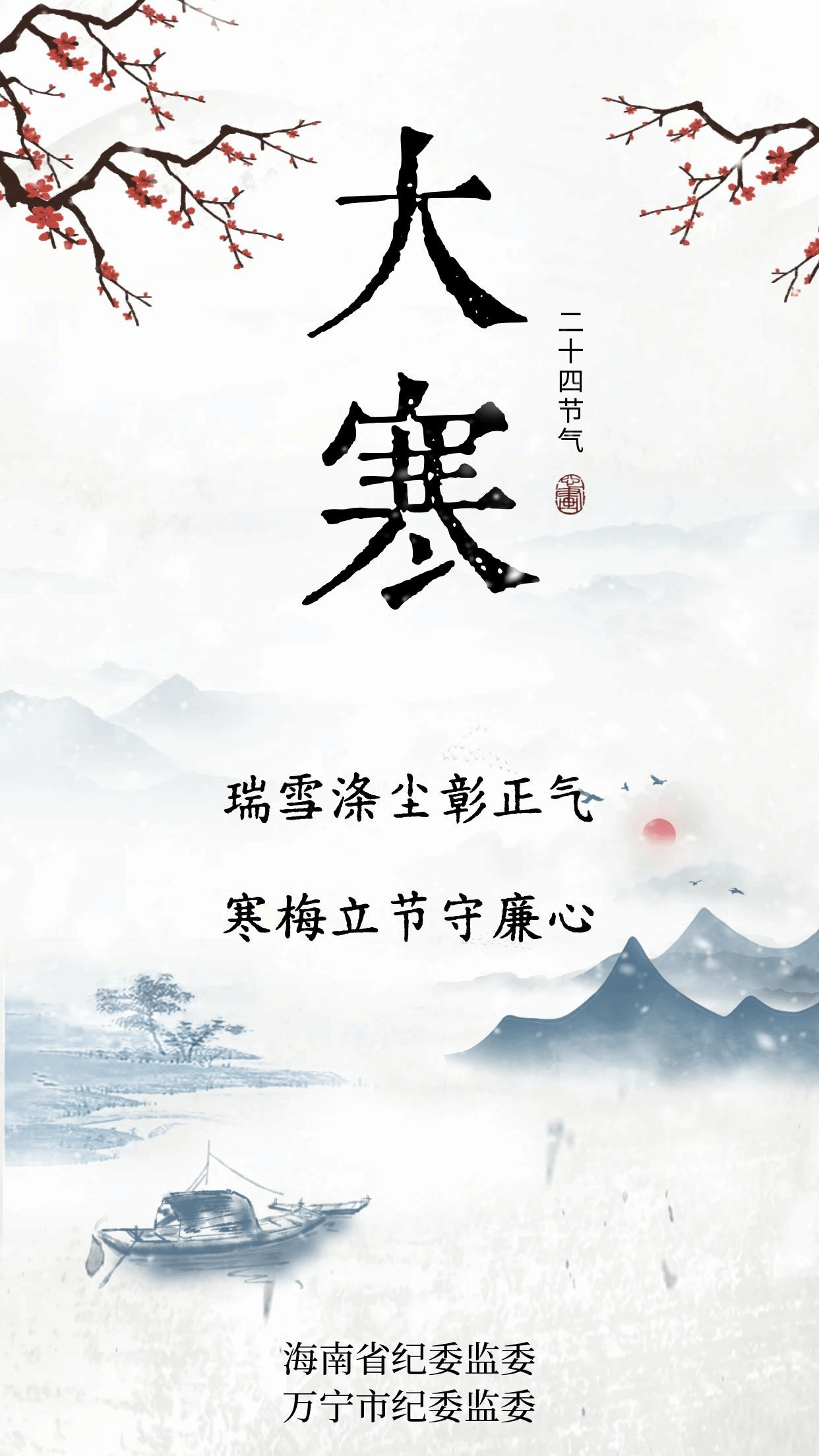 大寒春将至,奋进正当时。立于高标准建设海南自由贸易港的新起点,全省广大党员干部当心存敬畏、行守廉律,如雪净尘寰般涤荡私欲杂念,如梅立严冬般恪守清廉本色,树立和践行正确政绩观,用扎实奋斗创造经得起实践和历史检验的工作业绩。