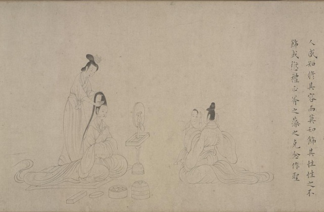 《女史箴图》宋人摹本中对镜修容的女性,旁边的文字说“人咸知修其容,而莫知饰其性”,认为应更加重视道德修养。东汉蔡邕也有类似观点,他在写给女儿的家训中说“夫面之不饰,愚者谓之丑;心之不修,贤者谓之恶”,修心比修容更重要。资料图片