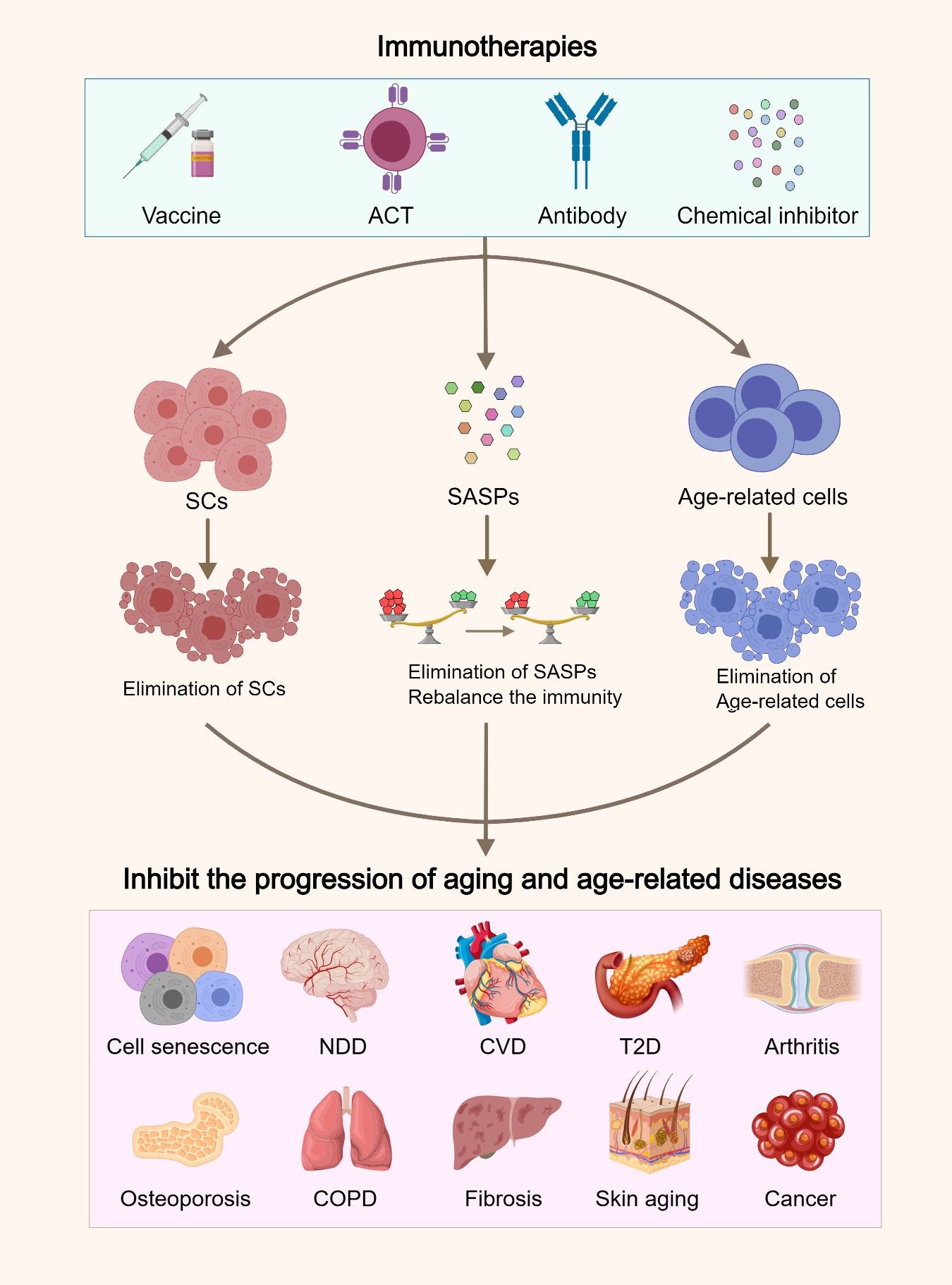 自古以来,人类对长生不老的追求从未停歇。随着医学的飞速发展,人类开始思索长生不老的可行性。尽管长生仍属幻梦,但抗衰老治疗已成功实现“延健康之寿”,减轻了老年人疾病负担与卫生系统的医疗压力,同时间接促进了经济的发展。衰老相关通路、衰老细胞以及衰老相关分泌表型(SASP)被认为是衰老进程中的重要内因。通过小分子干预相关衰老因素已经实现衰老进程的显著延缓,但其较大副作用限制了小分子的广泛应用。免疫治疗的革命性突破使得精准清除相关衰老因素成为了可能,全球已有多项关键成果证明了衰老免疫疗法的重大优势。该综述系统梳理了疫苗、单抗、免疫细胞回输在内的免疫治疗策略在清除衰老细胞和重塑免疫微环境中的机制与应用,同时概括免疫疗法在神经退行性疾病、心血管疾病、2型糖尿病、关节炎、骨质疏松、慢性阻塞性肺炎、纤维化、皮肤衰老以及癌症多个衰老相关重大疾病中的最新进展与临床试验数据。另外,作者还指出,需警惕免疫衰老导致的疗效衰减及“脱靶”毒性,强调了基于单细胞和空间转录组学的“最低体内衰老实验信息标准(MICSE)”的重要性。本文最后结合近年新兴的人工智能技术,总结并提出“多组学-大数据-AI-纳米机器人”四位一体的个体化免疫抗衰老蓝图,为未来的衰老免疫治疗的研究思路提供了新见解。
