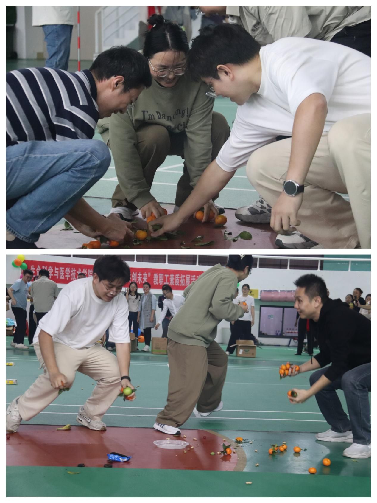 随后的团队竞赛环节更是精彩纷呈。“袋鼠跳”项目中,老师们化身成一只只“袋鼠”,奋力向前跳跃,完成一次又一次接力运球。赛场上既有身轻如燕的敏捷身影,也有不慎“出糗”的欢乐瞬间,在队友和对手的加油呐喊声中坚持跳到终点。“毛毛虫”项目要求队员们通力协作,考验着团队的耐心与协调;“队长赢福利”极大地激发了老师们的集体荣誉感。活动中,加油声、欢呼声、欢笑声此起彼伏,平日里在讲台上严谨授业、在实验室里潜心钻研的教师们,此刻都化身为了为团队荣誉而战的“运动员”,展现出了活力四射、昂扬向上的另一面。