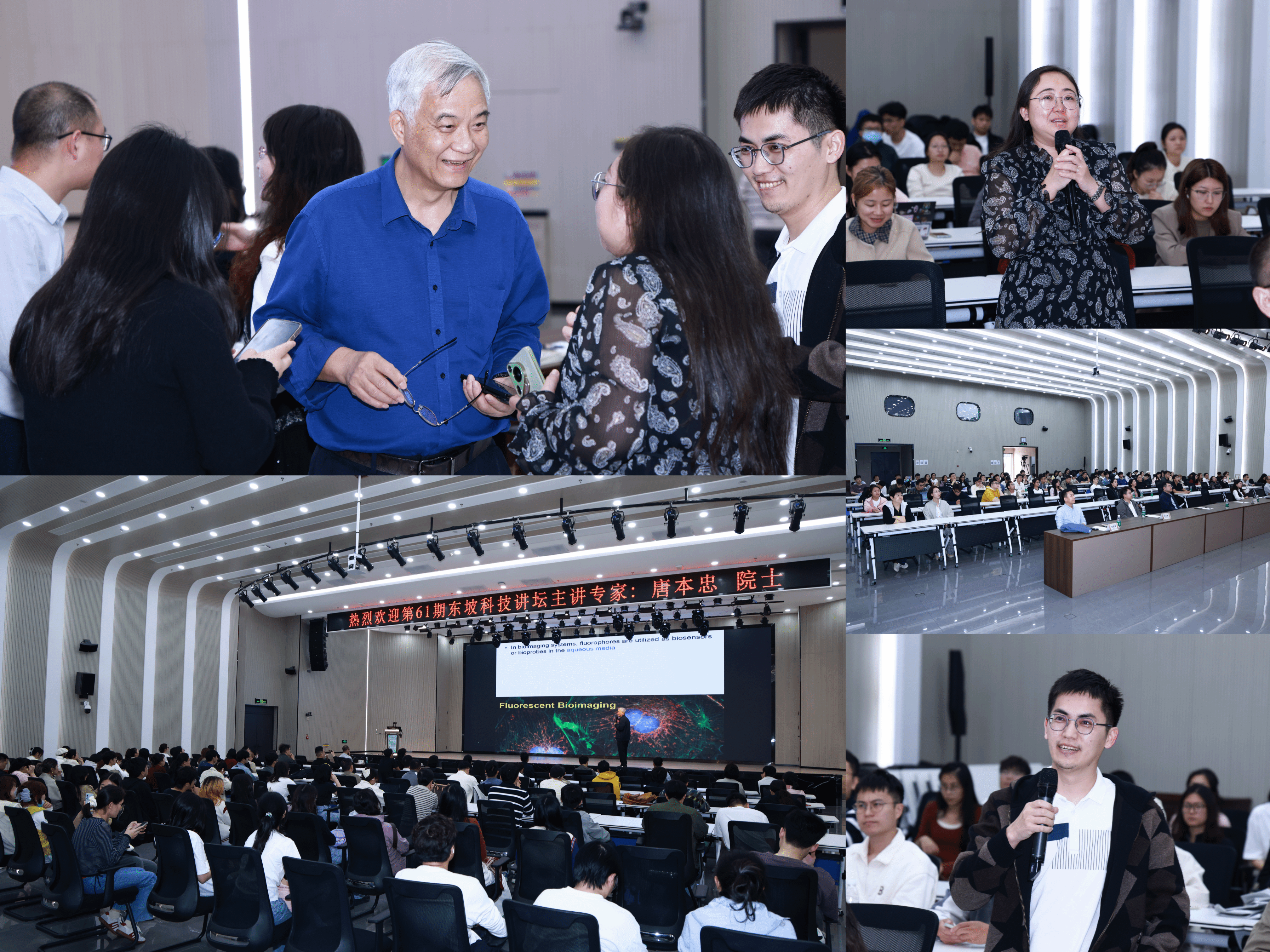 报告中,唐院士先介绍了自身学术背景,随后围绕聚集诱导发光(AIE)展开核心讲解,清晰阐明了其通过分子运动受限实现发光、克服传统荧光染料聚集猝灭(ACQ)难题的核心机制。唐院士重点阐述了AIE技术在生物医药领域的多元应用,该技术可实现细胞器免洗精准成像、癌细胞诊疗一体化、生物过程长效追踪与肿瘤良恶性鉴别、微生物与病毒的快速检测和高效治疗、药物体内可视化助力个性化治疗,还能依托近红外长波长完成深层生物成像,同时指明AIE纳米粒子具备生物相容性好、无毒且可被机体代谢排出的突出优势。此外,唐院士还从哲学视角对比还原论与整体论,指出生命是生物分子聚集体的活体系,聚集会涌现新性质,而AIE技术正是研究生命体系多级结构可视化、动态过程追踪与涌现性质的理想工具。他还介绍道,其团队正积极推动AIE技术的产业化发展,不仅搭建了聚集体科学相关数据库,还创办了化学类一区顶刊《聚集体》(Aggregate),为该领域的研究与发展提供了重要支撑。