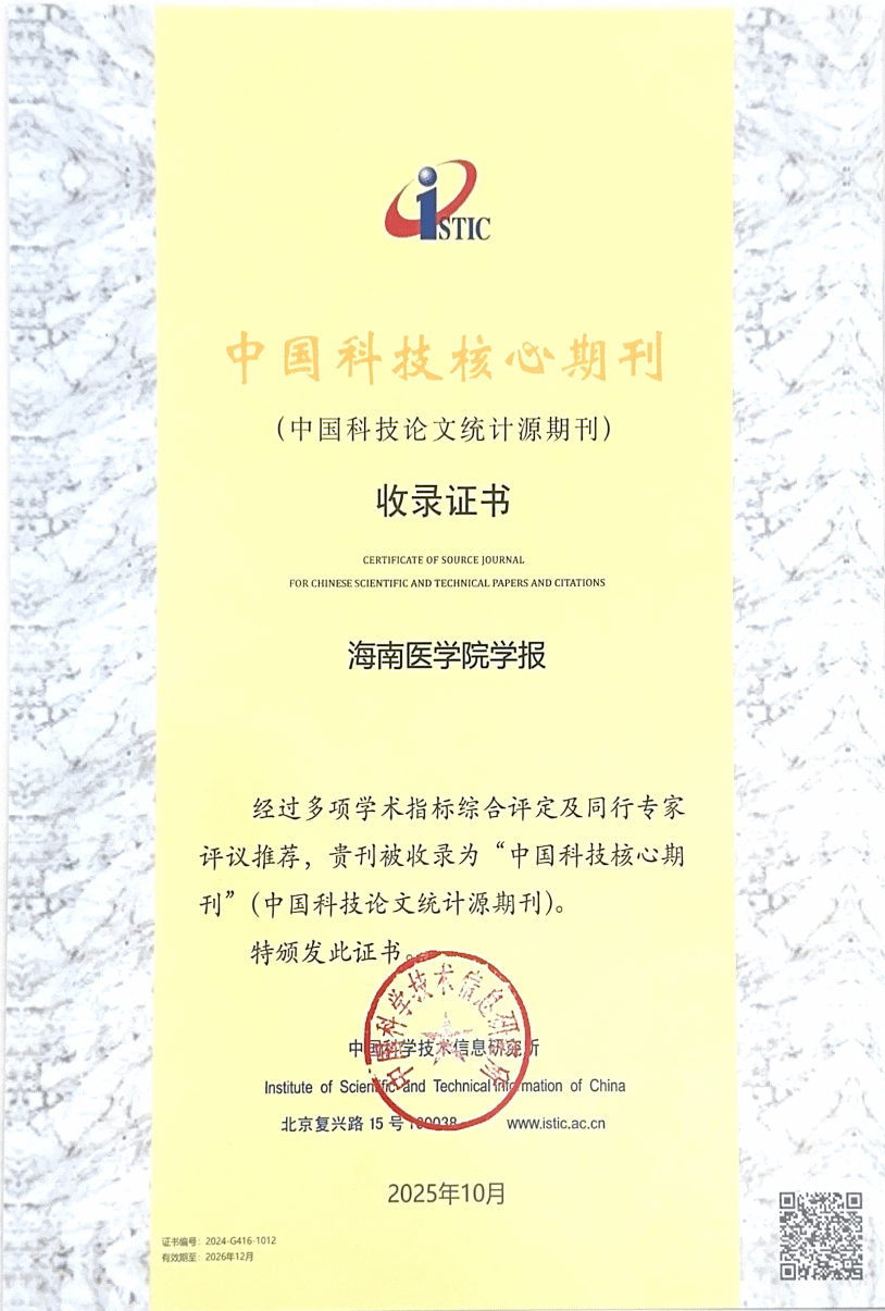 《海南医科大学学报》为北大中文核心期刊、中国科技核心期刊、RCCSE中国权威学术期刊(A+)、《中国学术期刊影响因子年报》统计源期刊、第6届中国精品科技期刊、《WJCI报告》来源期刊。