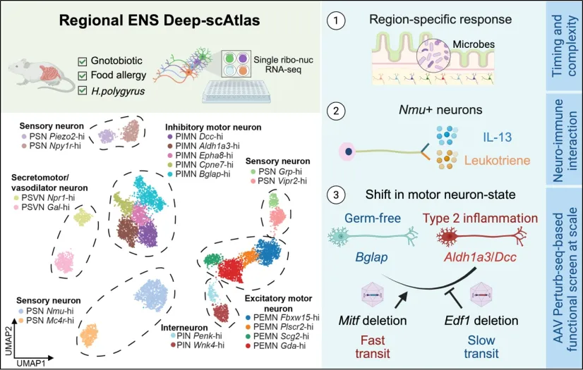 本研究通过对来自悉生小鼠、食物过敏小鼠和寄生虫感染小鼠不同肠段的神经元进行深度测序,绘制出迄今为止最完整的iEAN区域化和免疫环境特异性的单神经元转录组图谱。该研究揭示了微生物菌群的定植时间与复杂性以及2型炎症反应会导致运动神经元状态转变,并影响多种功能各异的感觉神经元,包括对IL-13和白三烯敏感的Nmu-hi感觉神经元,以及Grp-hi感觉神经元——这些神经元在无菌小鼠的结肠组织中数量增多,并与介导肠蠕动的Grpr+Cajal间质细胞发生相互作用。