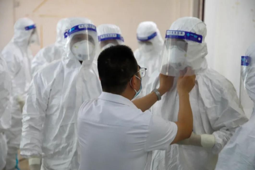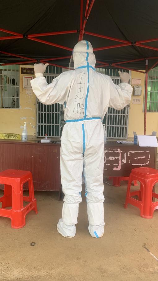 8月11号,早上,在新坡村支部书记的带领下,王志鹏等老师来到了村里的防疫工作站,早早的,村民就已经排好长队等待做核酸,他和战友们快速穿戴好防护装备,迅速投入到紧张而有序的核酸检测工作之中。经过一上午的努力,到中午十二点核酸检测工作做完,他和战友们的衣服全部湿透,防护面屏布满了水汽,脱下密闭的防护服后,手部已经泡得白胀、粗糙。