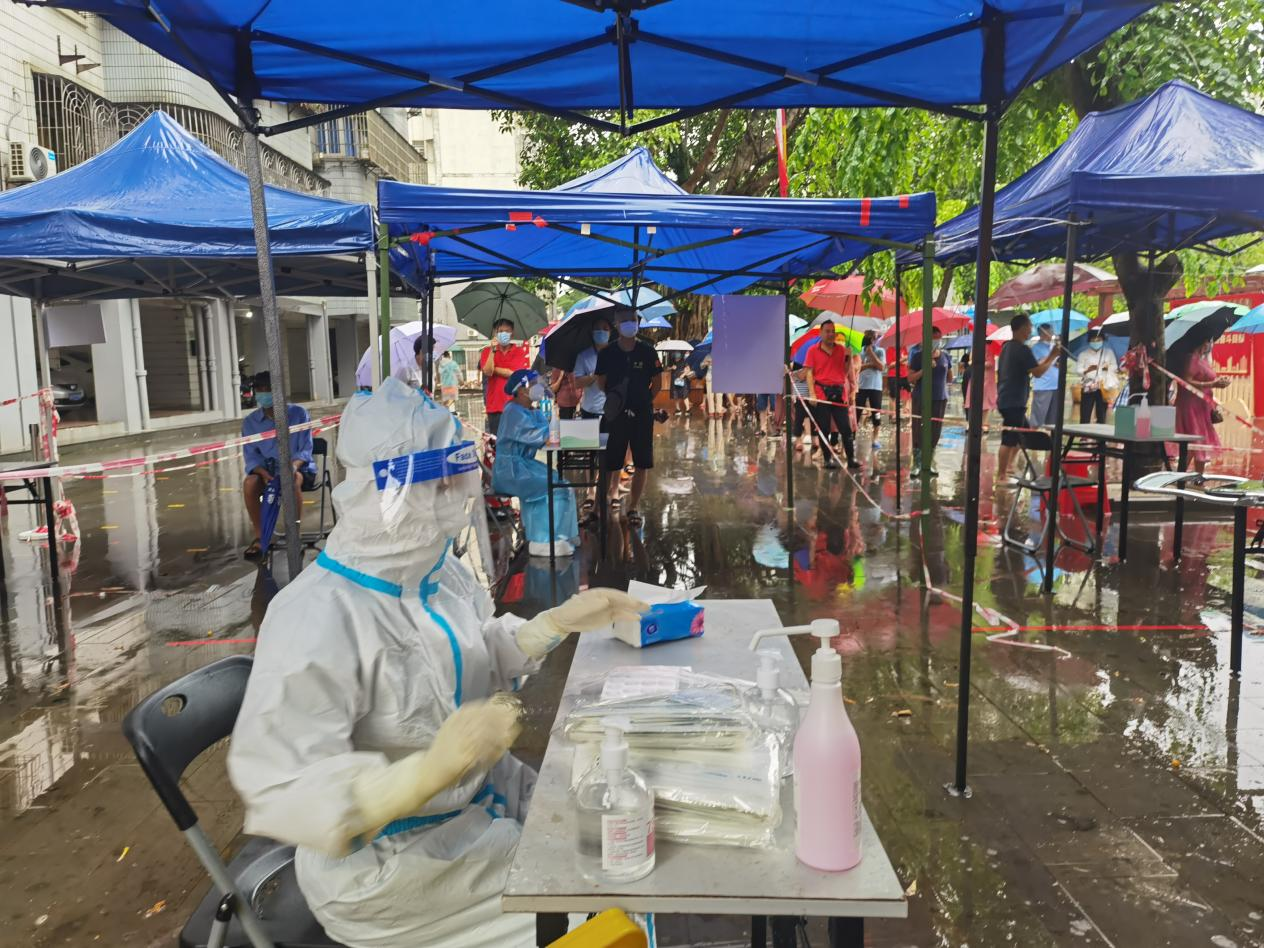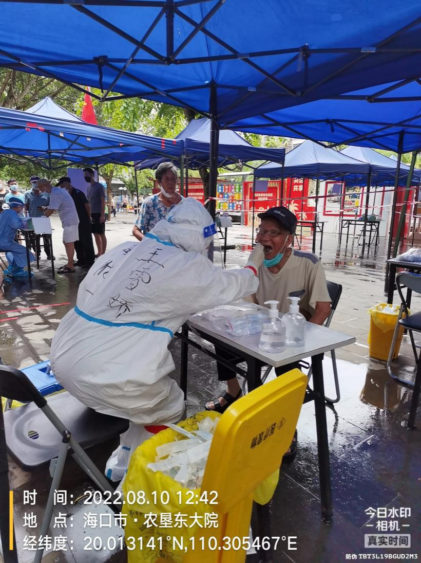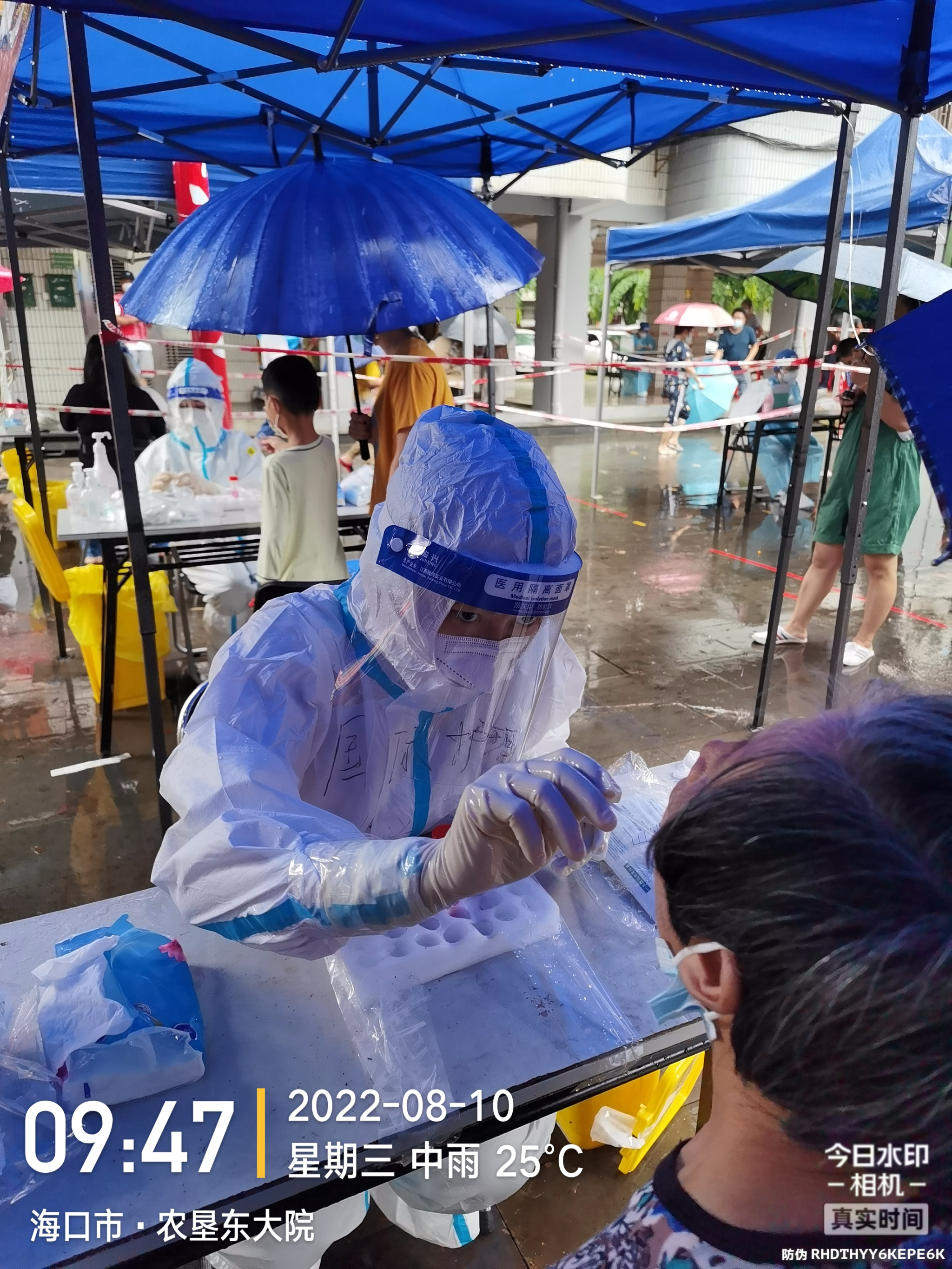 8月10日,海医一附院需要负责海口市66个点位的核酸采样工作。清晨,今年第7号台风“木兰”(热带风暴级)逼近海南近海,朝广东徐闻奔去。由于担心台风天风雨影响交通不便,5点不到,作为组长的她就爬起来,开始一一打电话联络组员,召集大家到医院乘车。而前一个晚上她工作到凌晨1点,睡眠不足4个小时。6:20匆忙吃上几口早餐就和组员们出发奔赴华垦社区东大院采样点。这一日的倾盆大雨,没能阻挡住医护人员前往核酸采样点的脚步,7点,所有采样人员准时出现在66个点位上。