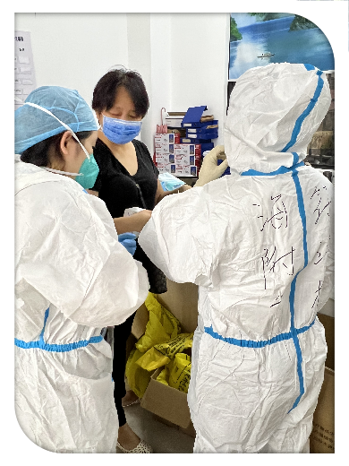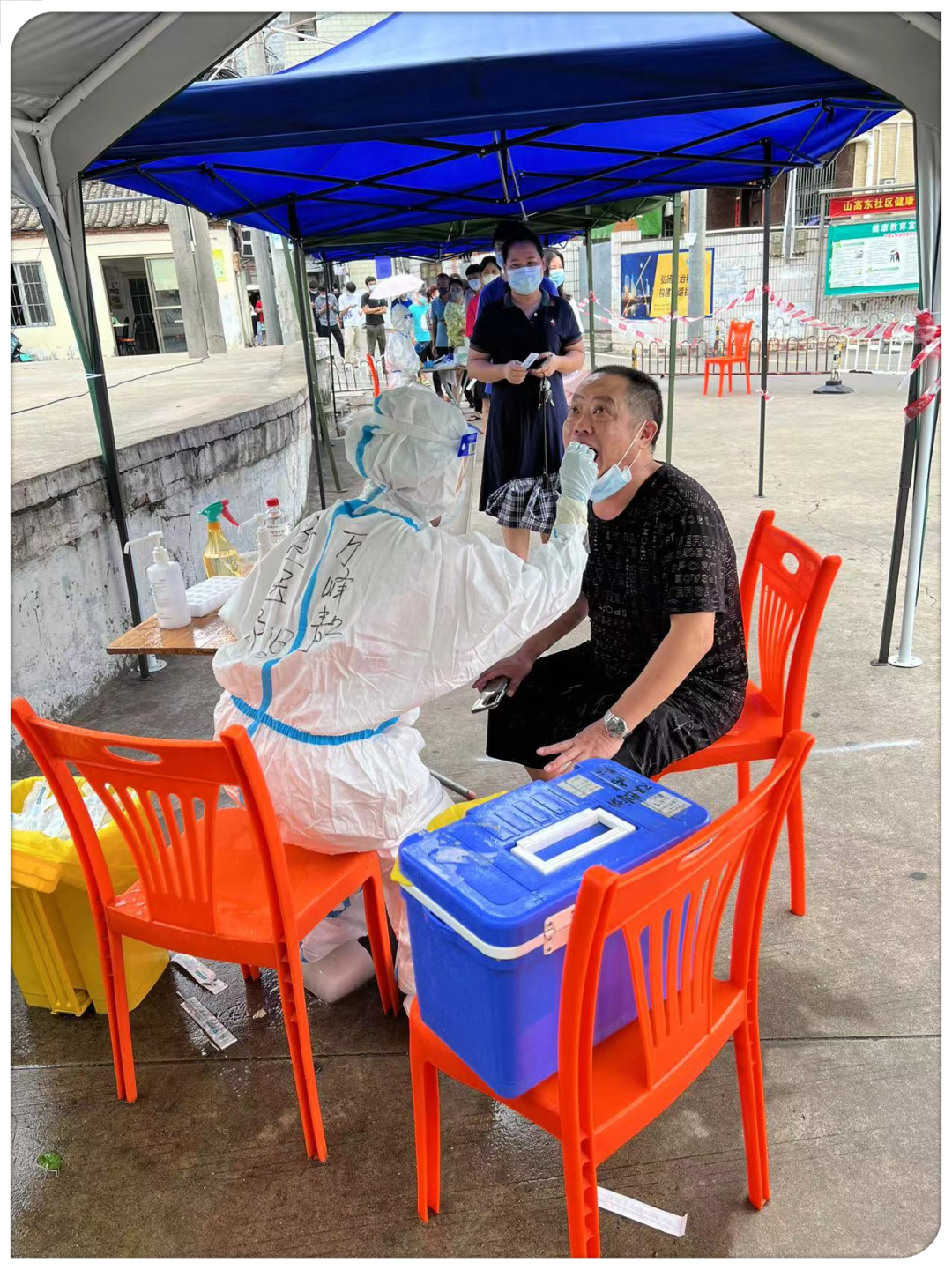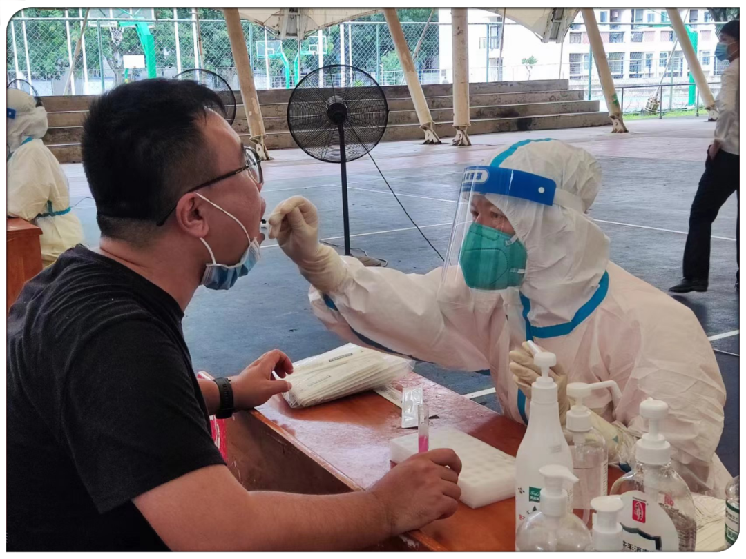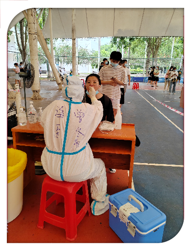 曾教授在号召鼓励研究生积极参加抗疫一线工作的同时,自己也积极主动投入到抗疫工作中。她说:“每天看到招募志愿者的消息心情既沉重又激动,沉重的原因是我们的抗疫之路任重而道远,激动的是我又能再一次穿上这一身白色战袍上‘战场’了。在最早招第一批志愿者时我就非常想参加,那时还处于居家隔离中,后面隔离期一满,我就报名参加了。参加核酸采样的每一天,我内心只有一个想法,那就是一心只想着完成当天安排的志愿工作,为疫情防控工作尽自己的一份力量。”